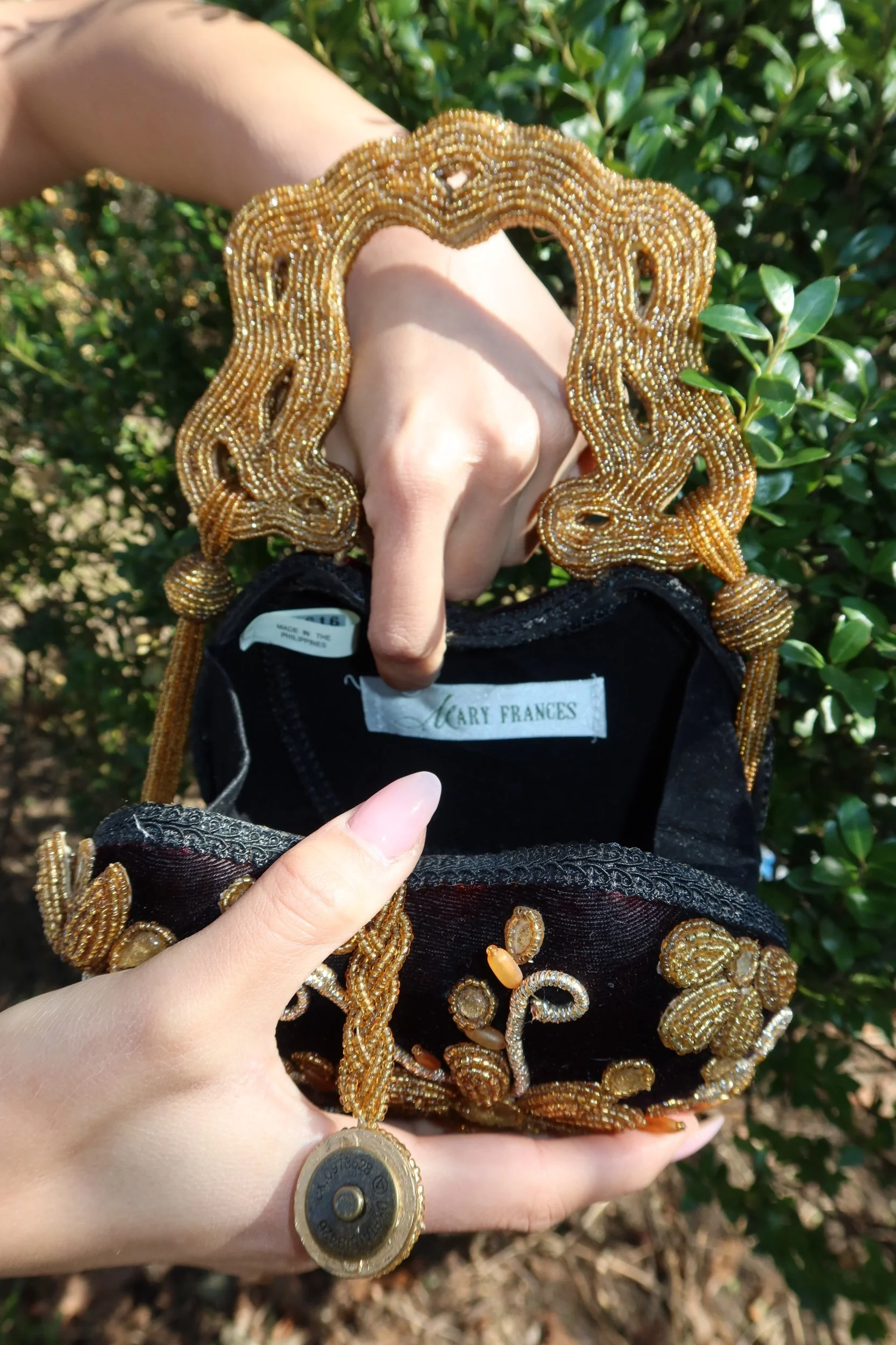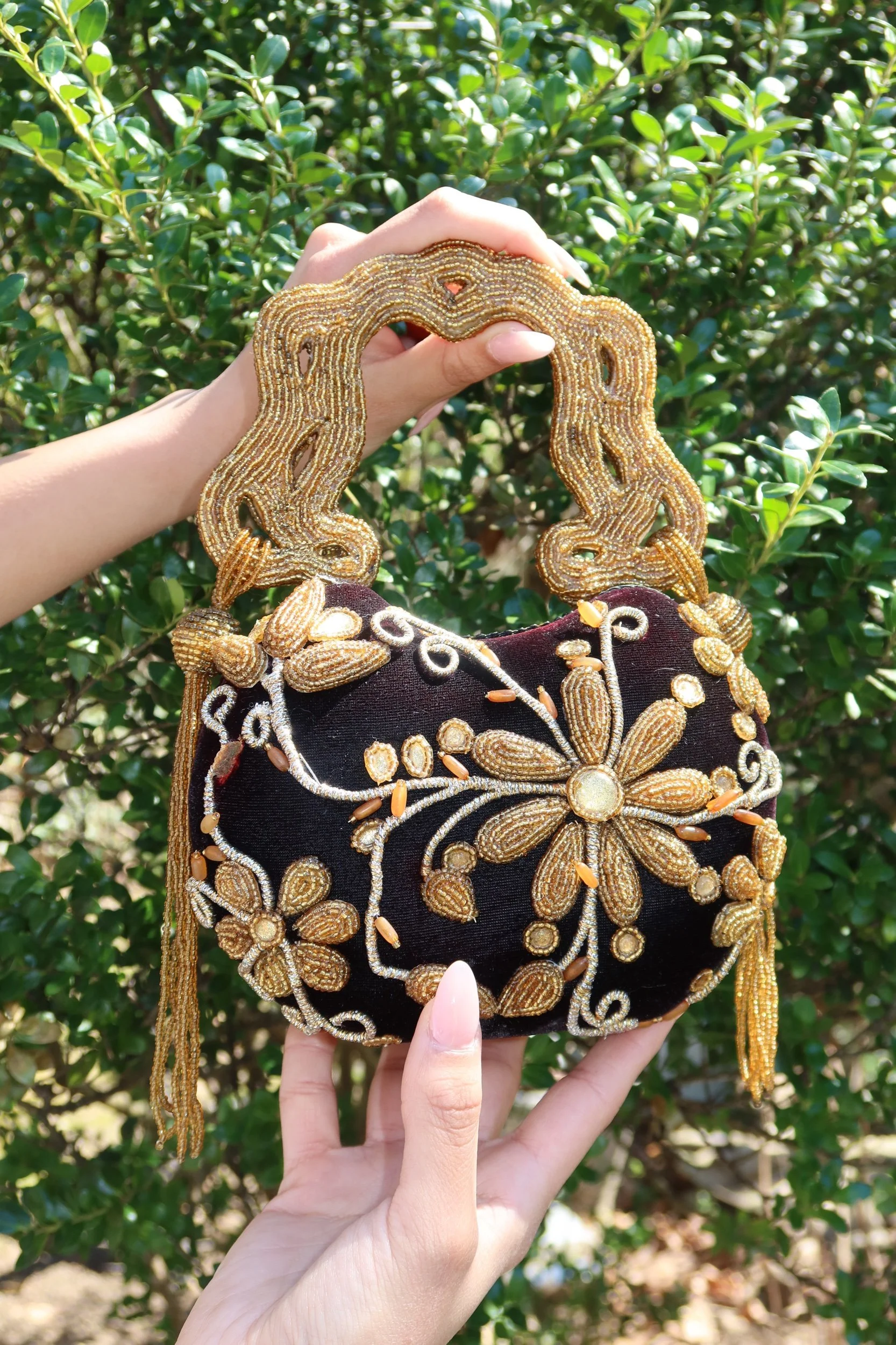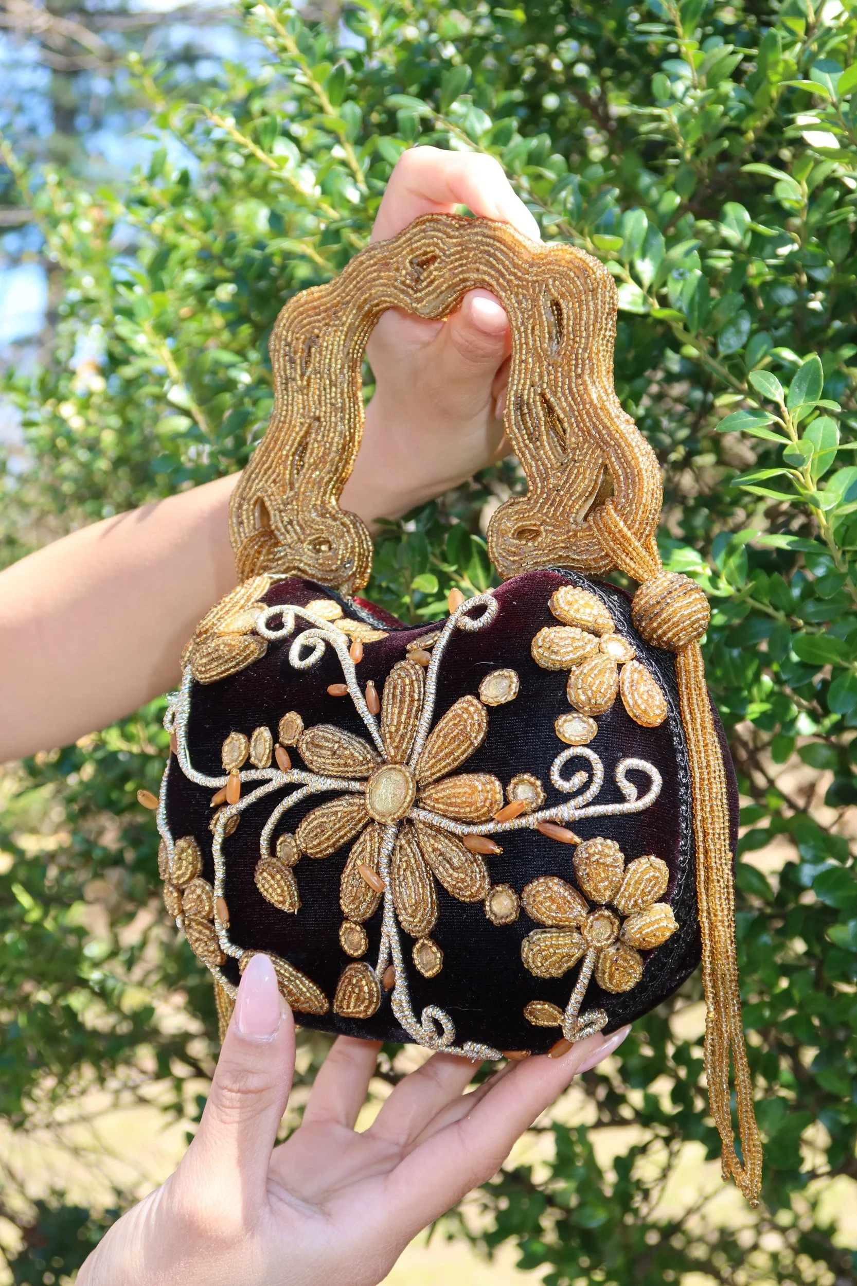 A true statement piece, this Mary Frances clutch features intricate hand-beaded detailing in rich gold tones over a deep velvet base. The sculptural beaded handle and ornate floral design make this a standout, collector-worthy accessory that instantly elevates any look.