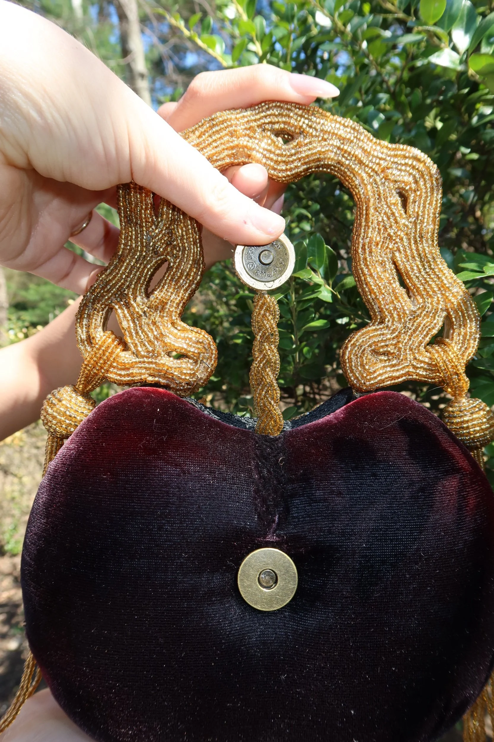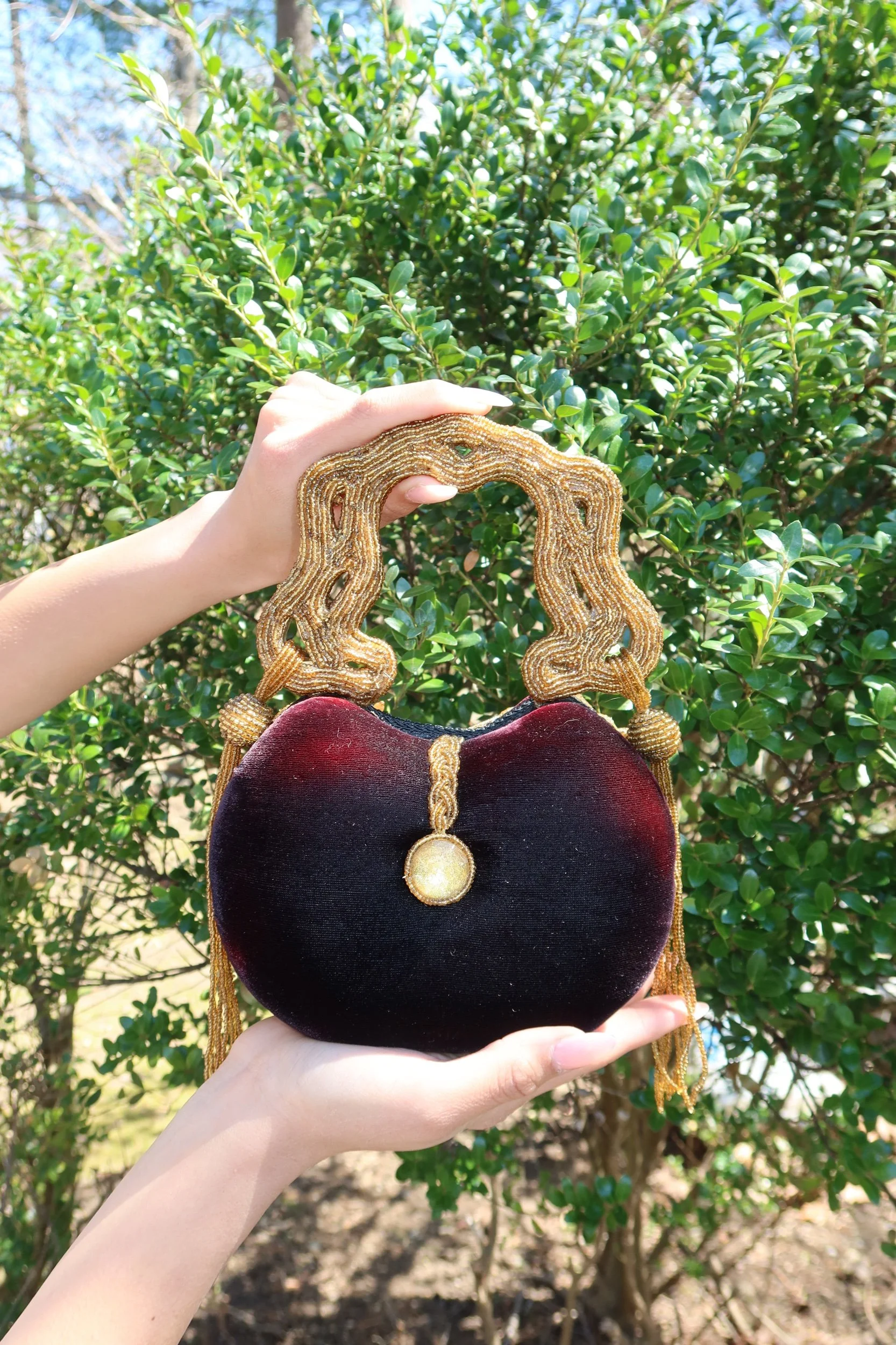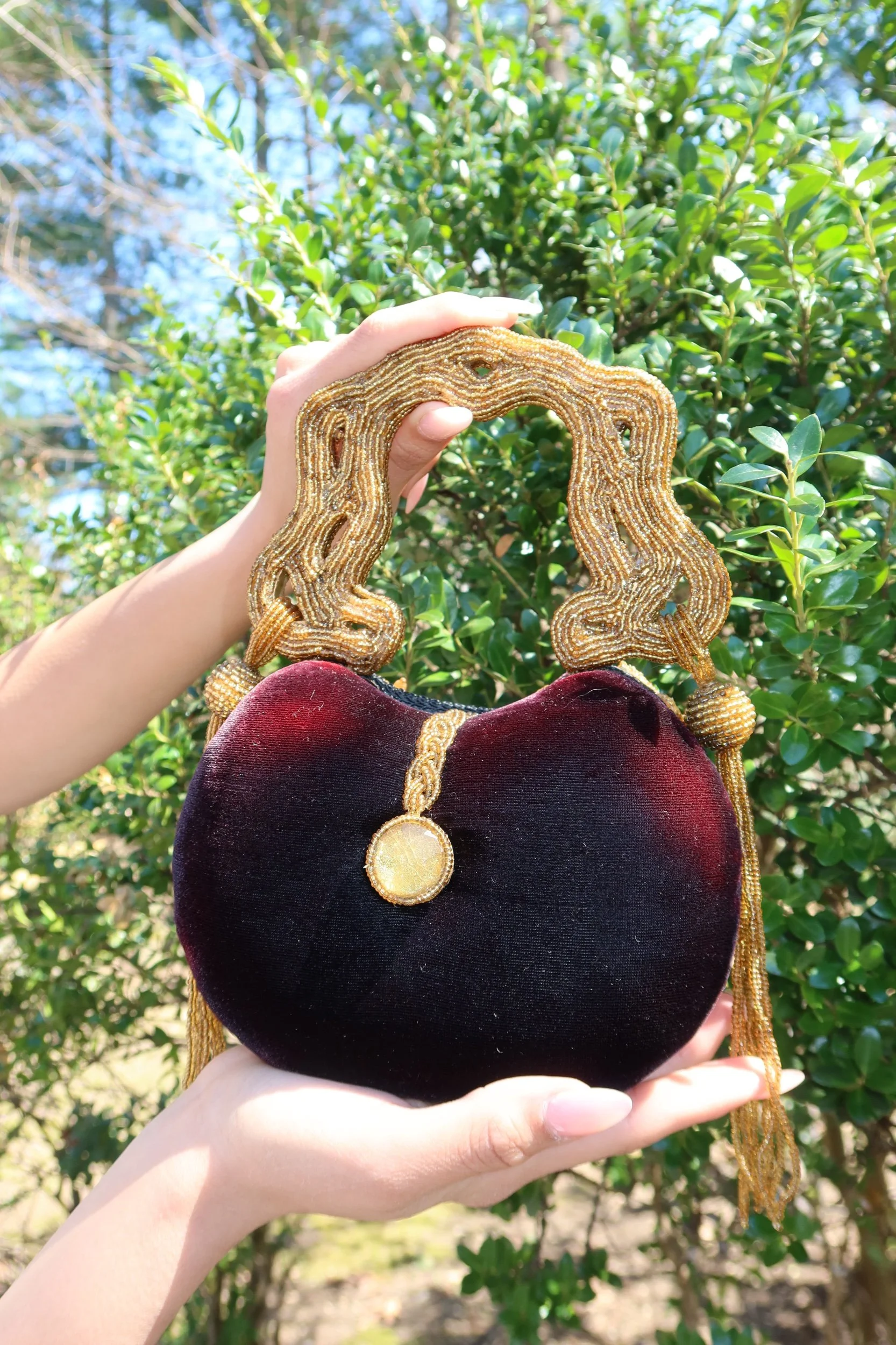 A true statement piece, this Mary Frances clutch features intricate hand-beaded detailing in rich gold tones over a deep velvet base. The sculptural beaded handle and ornate floral design make this a standout, collector-worthy accessory that instantly elevates any look.