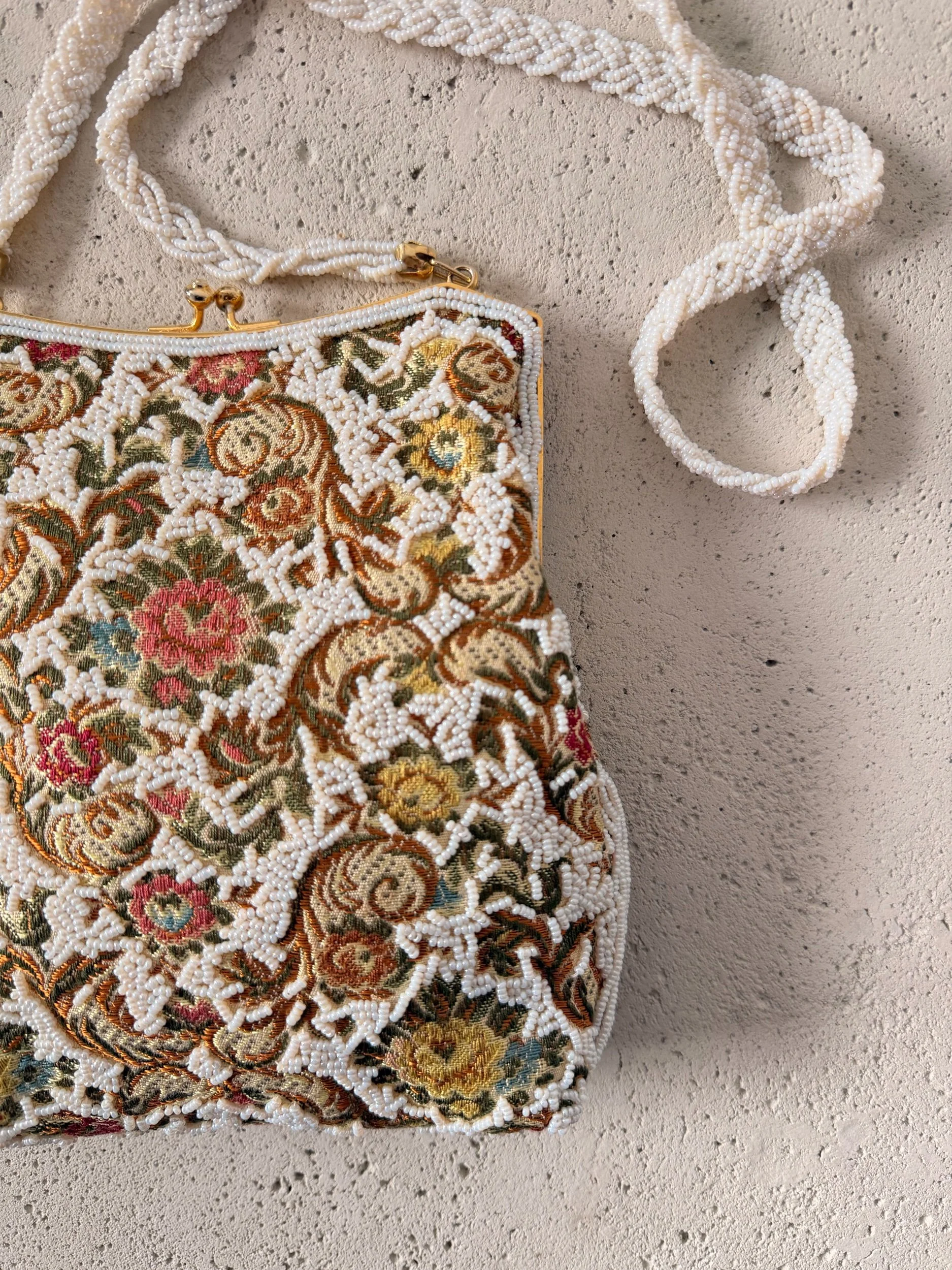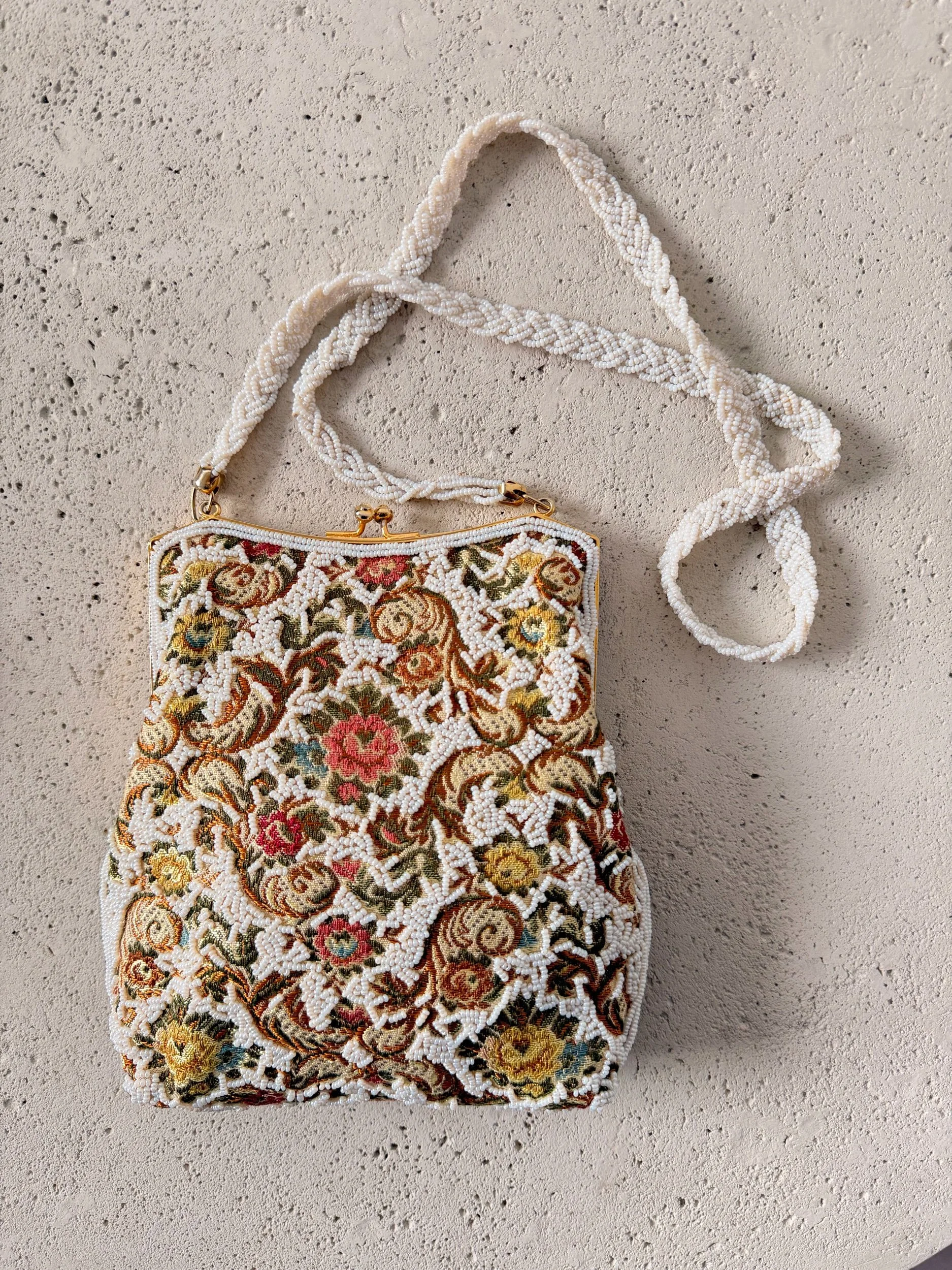 A true vintage treasure, this 1940s Walborg bag features intricate hand-beaded floral detailing with a beautifully textured finish and braided strap. Rich in character and craftsmanship, this piece feels like wearable history.