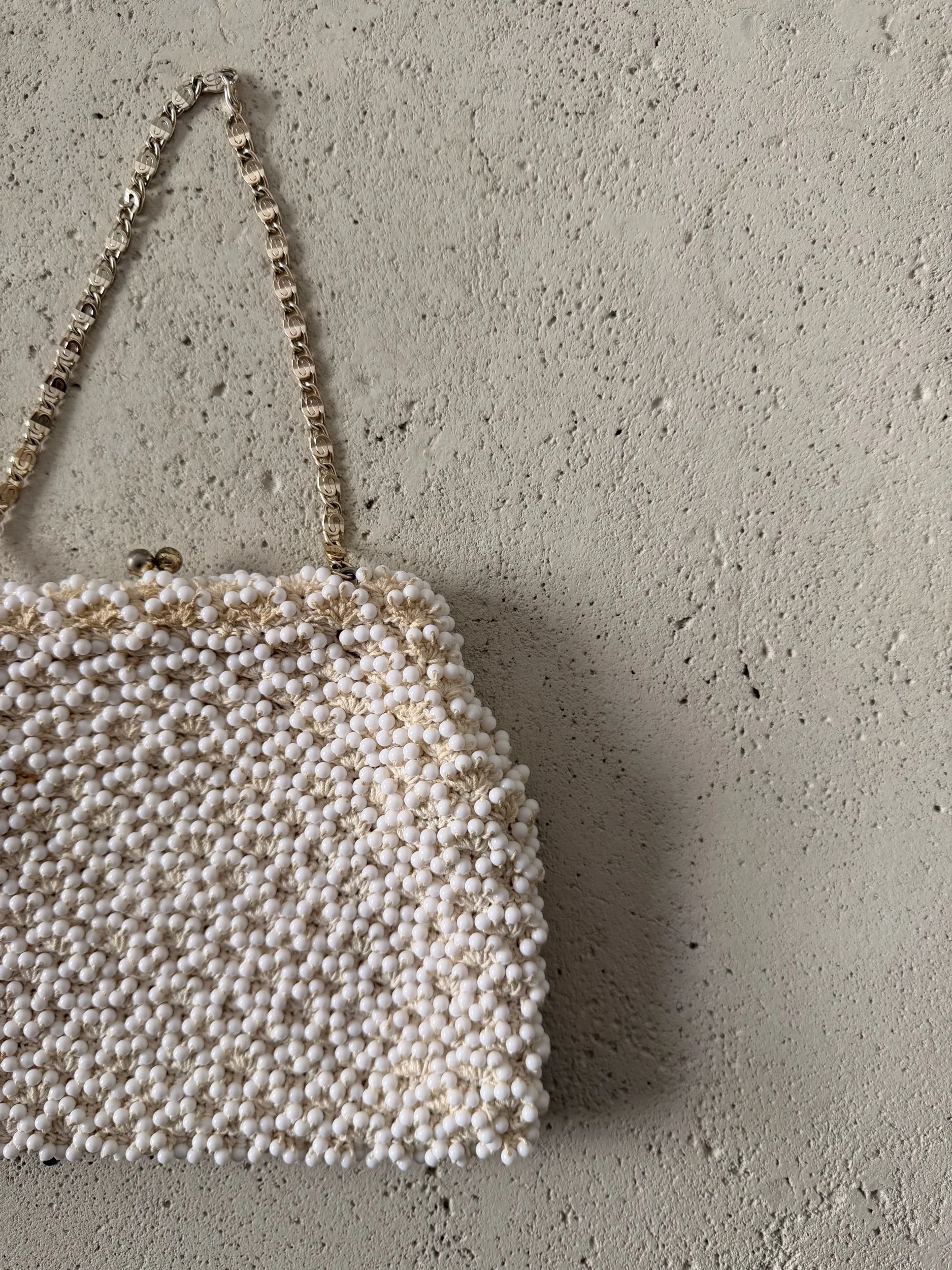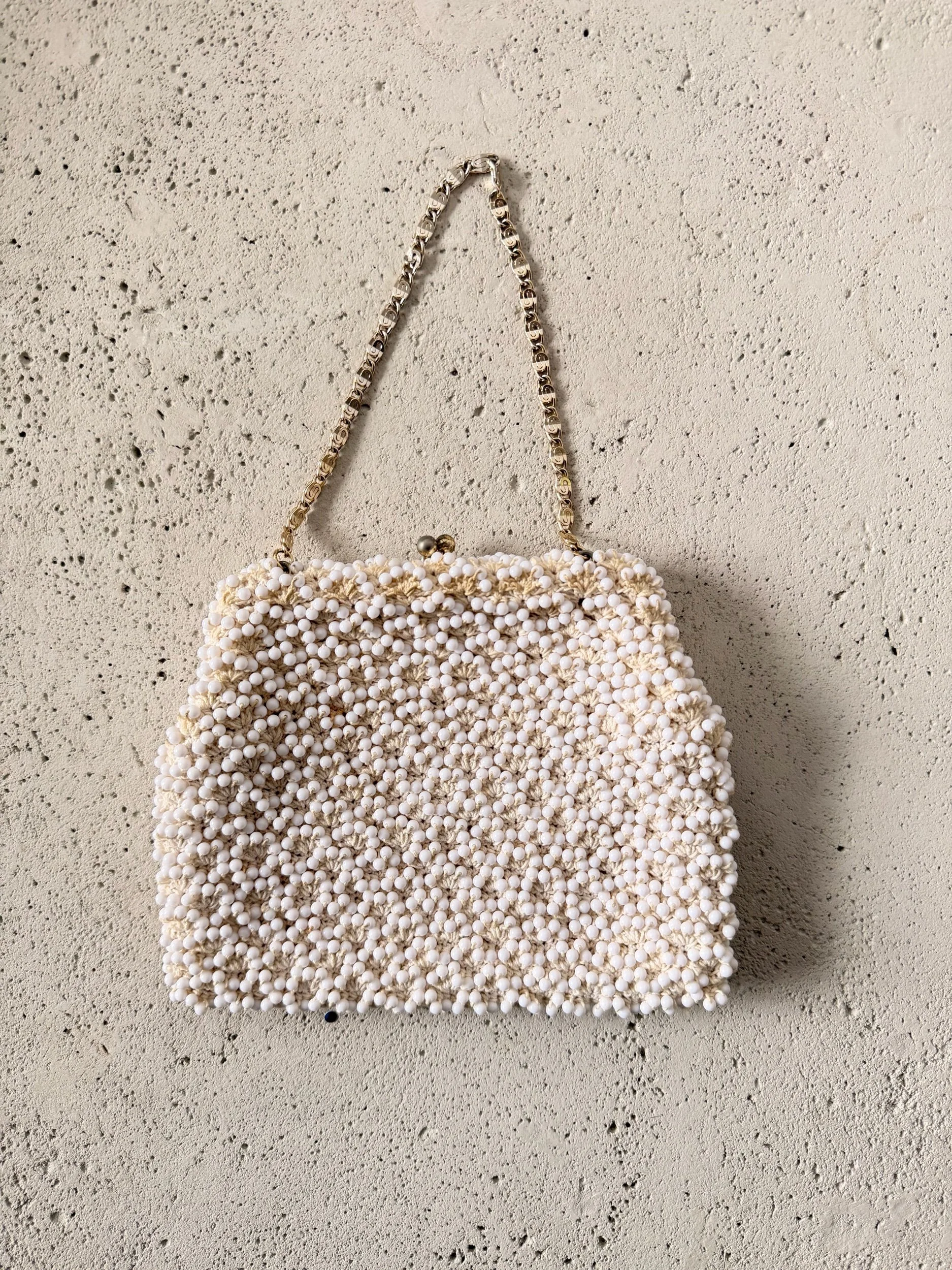 A timeless vintage classic, this 1950s Cordé bag features intricate hand-beaded craftsmanship in a soft ivory tone with a delicate structured silhouette. The textured beading and gold-tone chain handle give it an effortlessly elegant, heirloom feel.