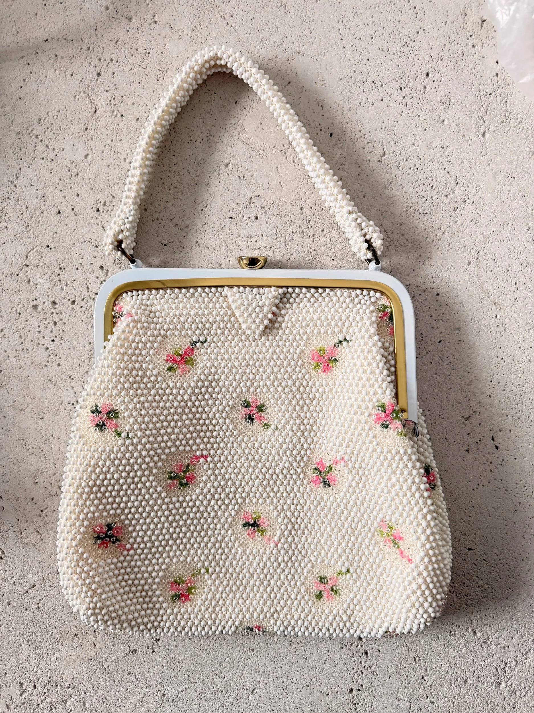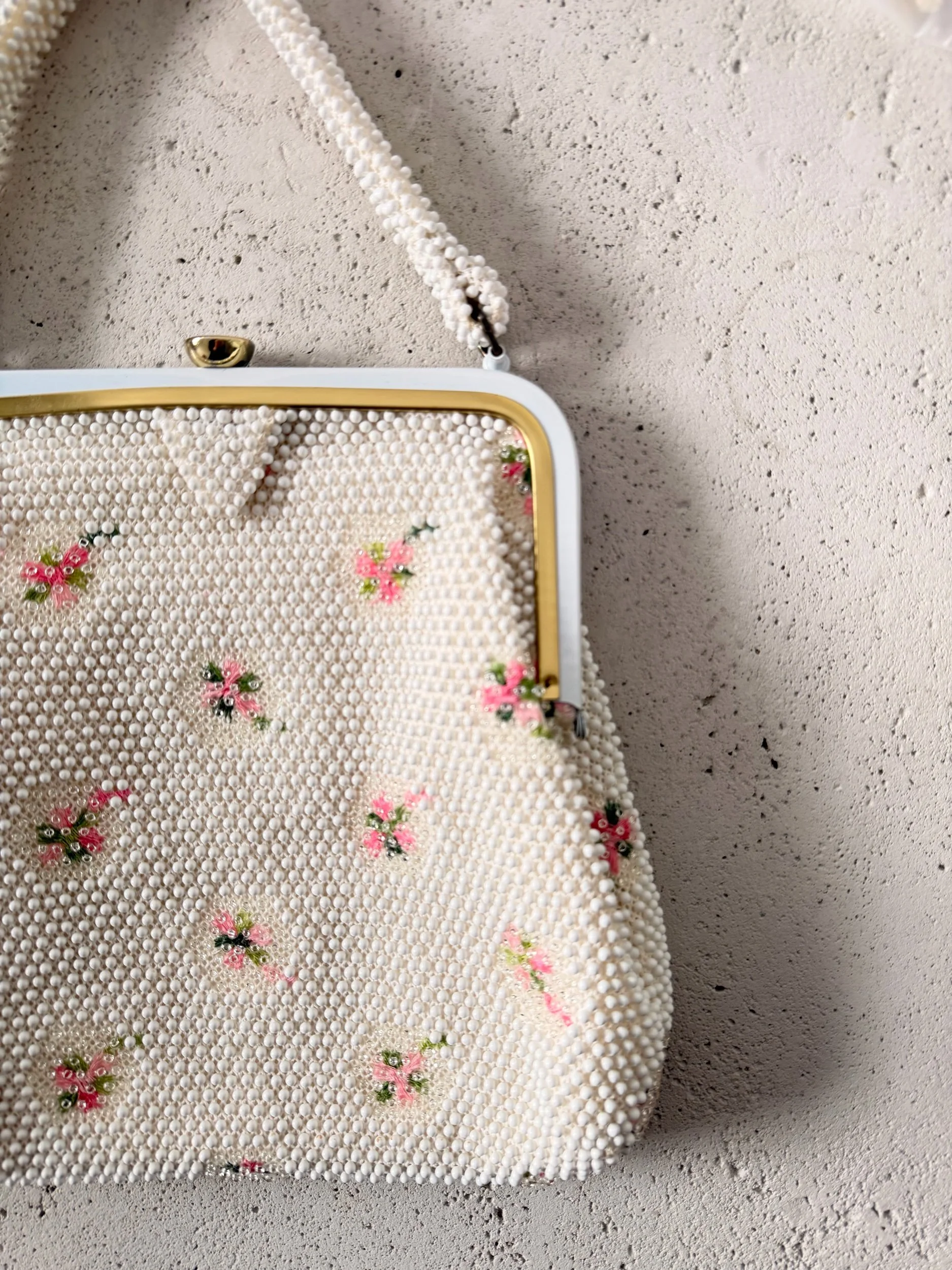 A delicate vintage treasure, this 1950s Cordé bag features intricate hand-beaded detailing with soft pink floral accents scattered throughout. The structured clasp frame and beaded handle give it a timeless, feminine charm.
