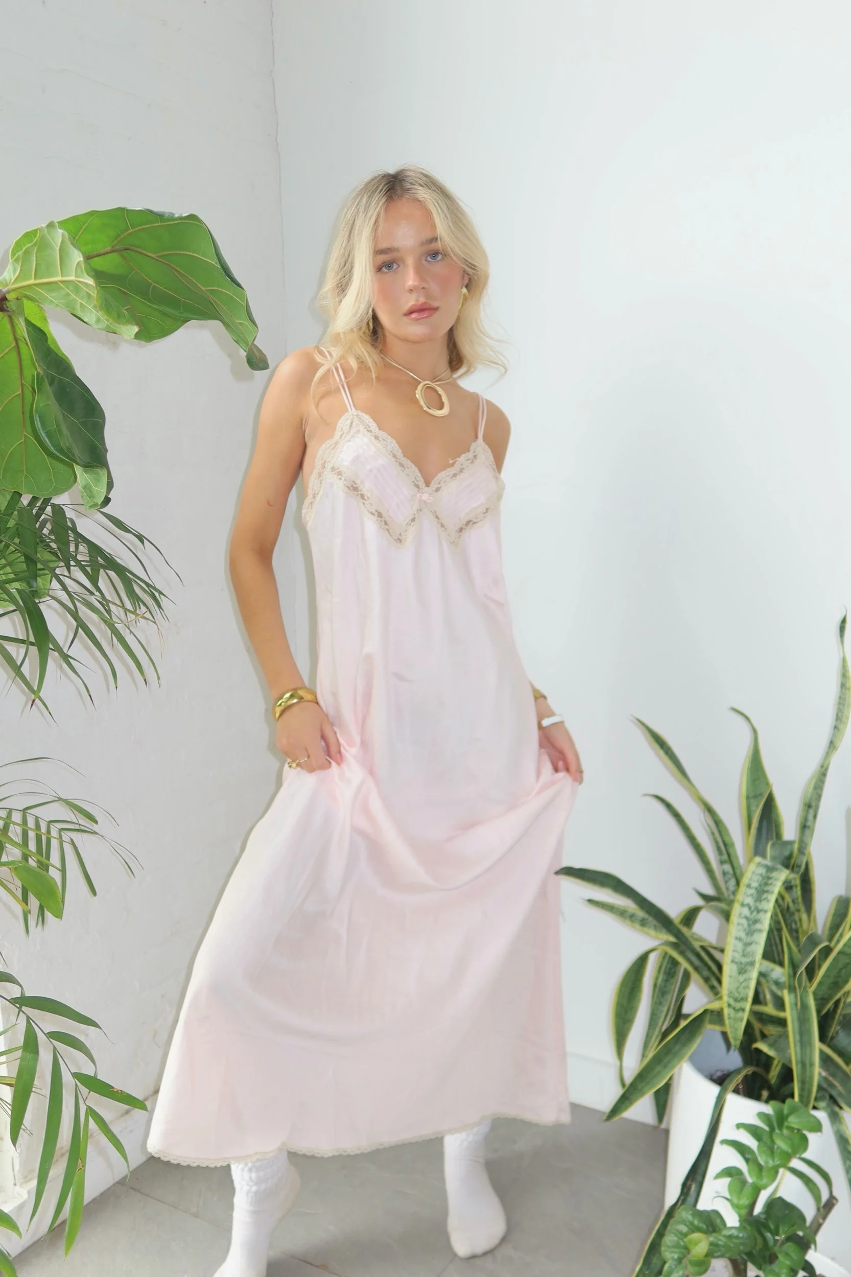 Delicate and dreamy, this Miss Elaine slip dress features a soft blush tone with lace-trimmed detailing along the neckline and bust. The lightweight, flowy silhouette gives it an effortlessly feminine feel—perfect for lounging, layering, or styling out.