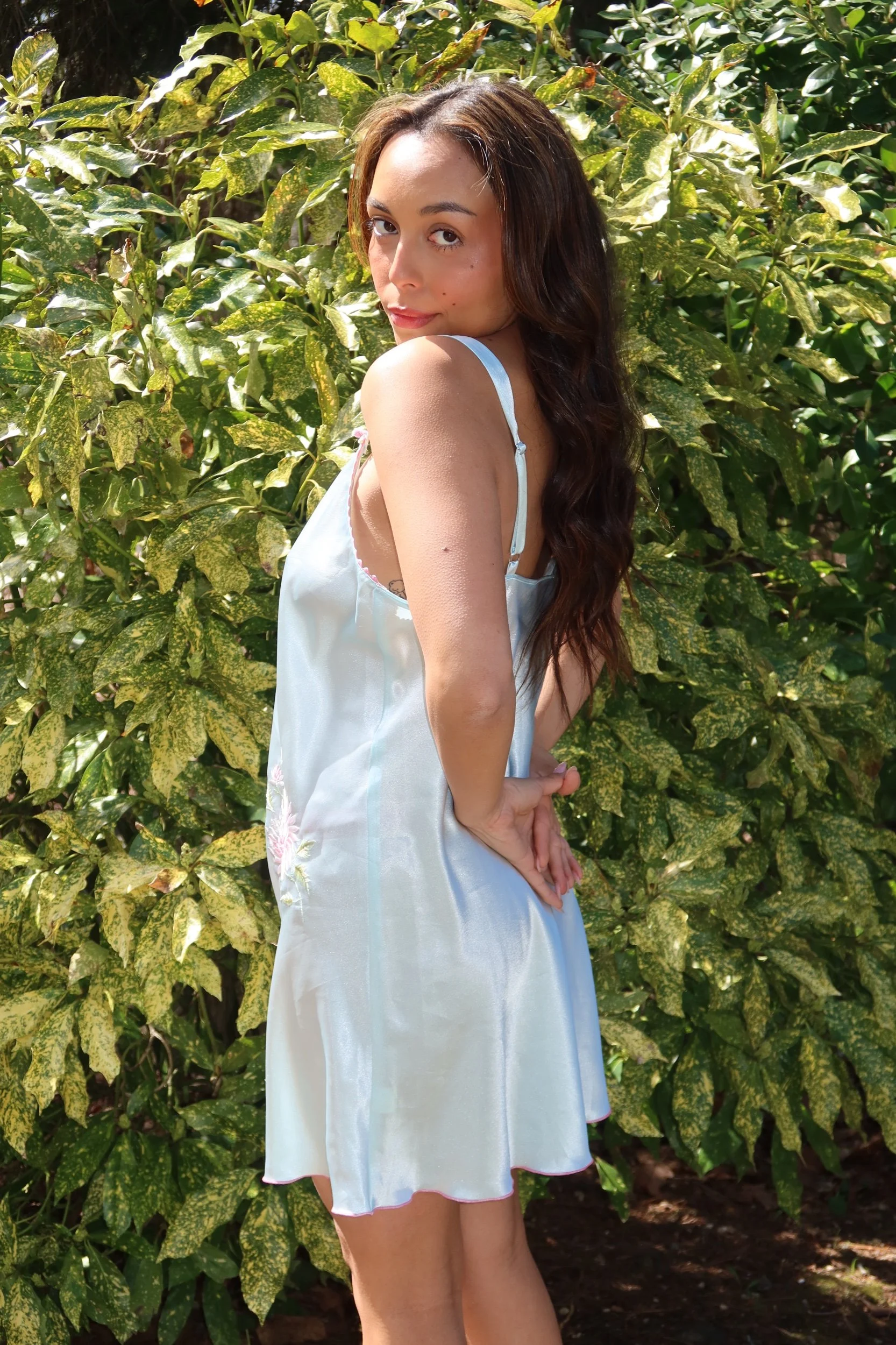 Delicate and effortlessly luxe, this Oscar de la Renta Pink Label mini features a soft, silky finish in the prettiest pale blue with subtle floral embroidery throughout. The slip silhouette drapes beautifully, giving that effortless, feminine feel that’s perfect for both lounging or styling out.