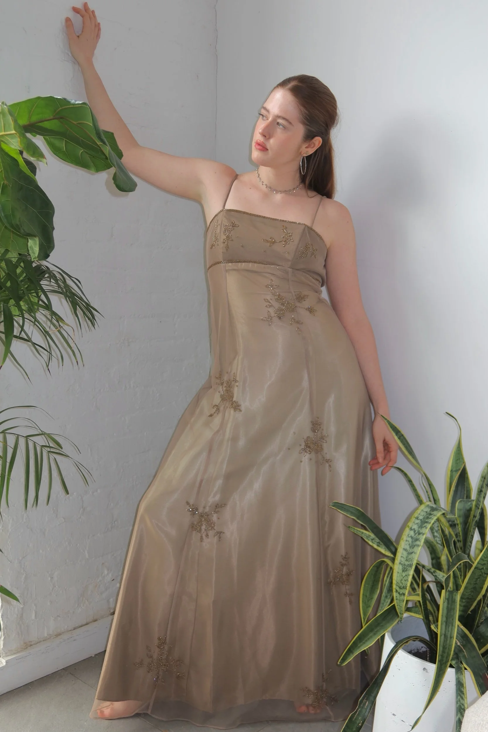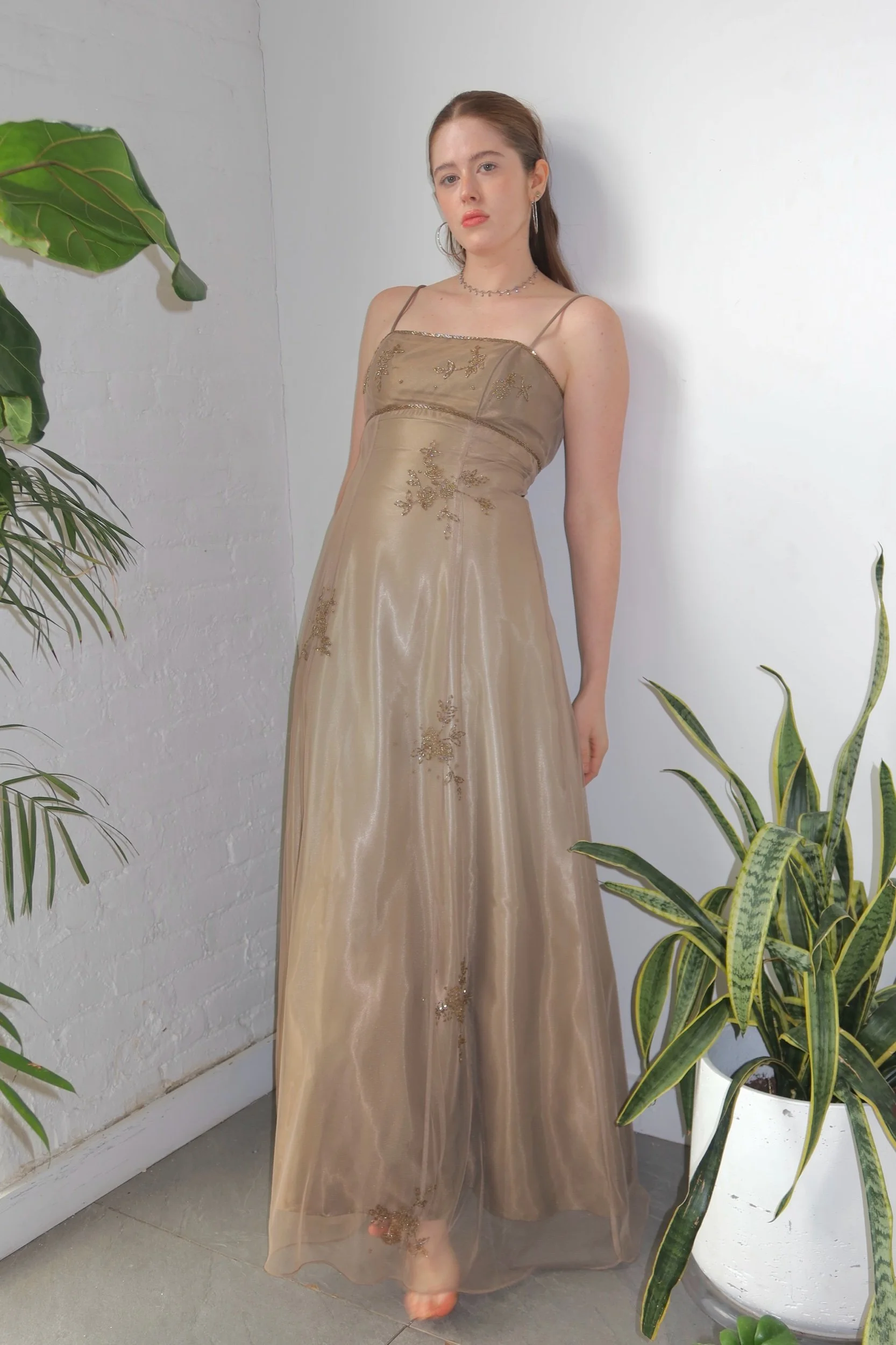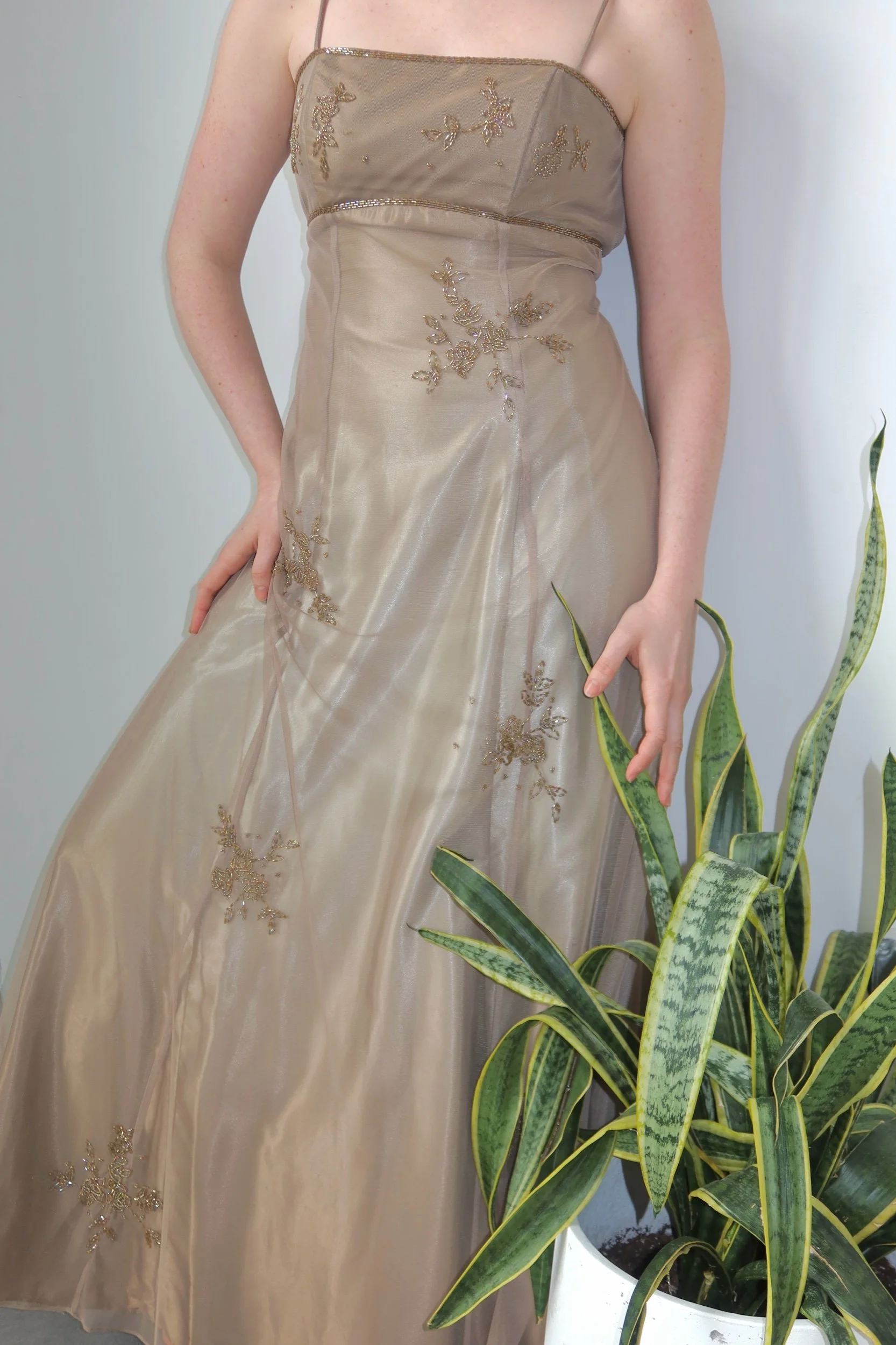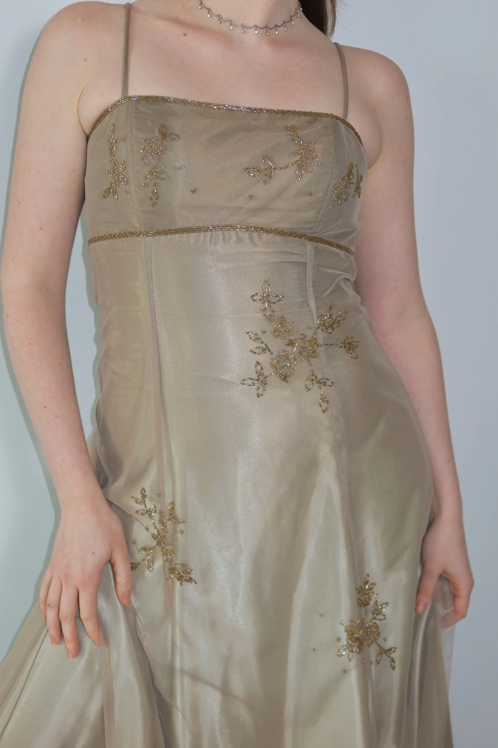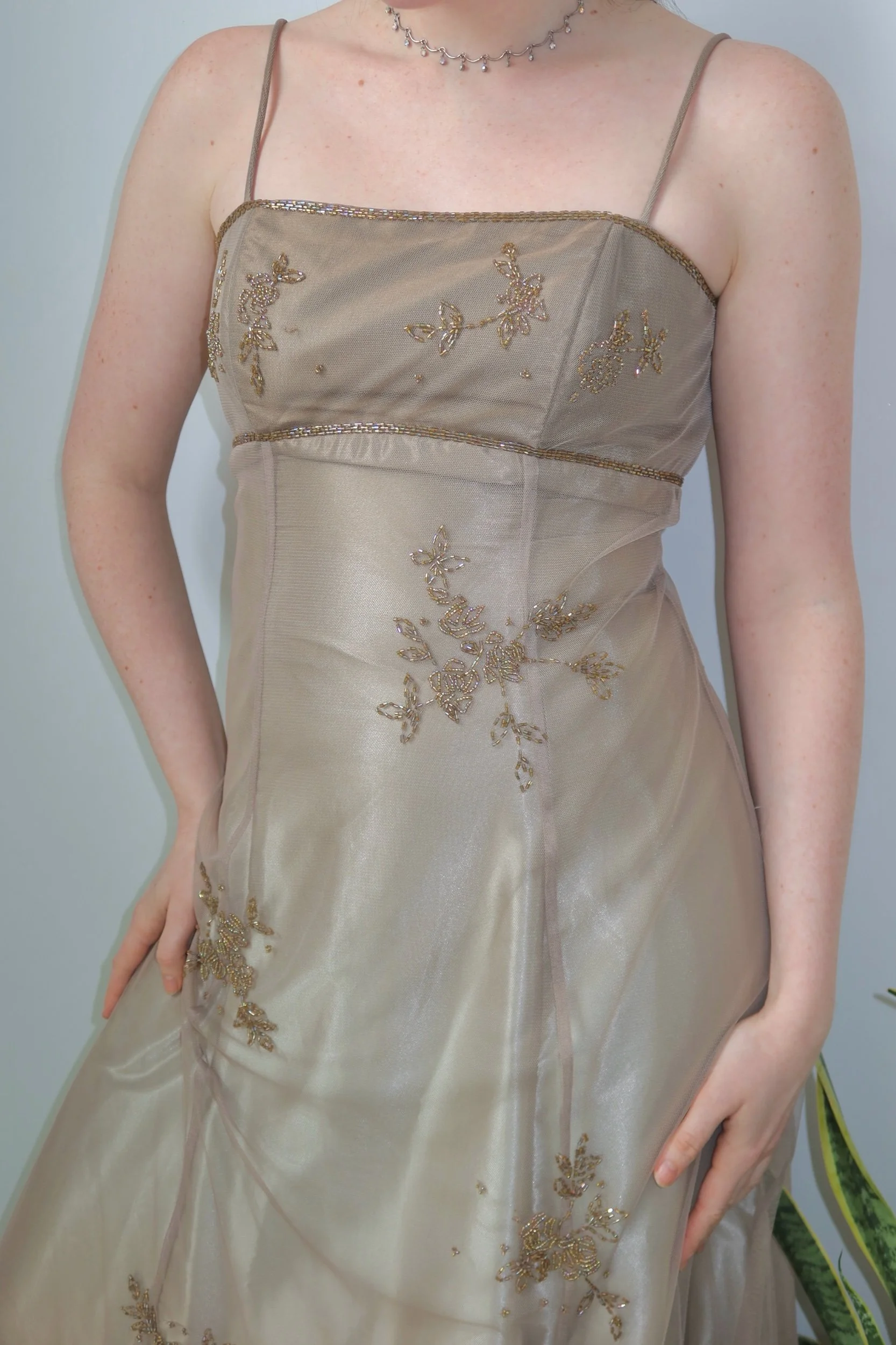 Elegant and timeless, this Blondie Nites gown features a soft champagne satin finish with delicate embroidered detailing throughout. The sleek, elongated silhouette and subtle sheen create an effortlessly refined look perfect for formal events and special occasions.