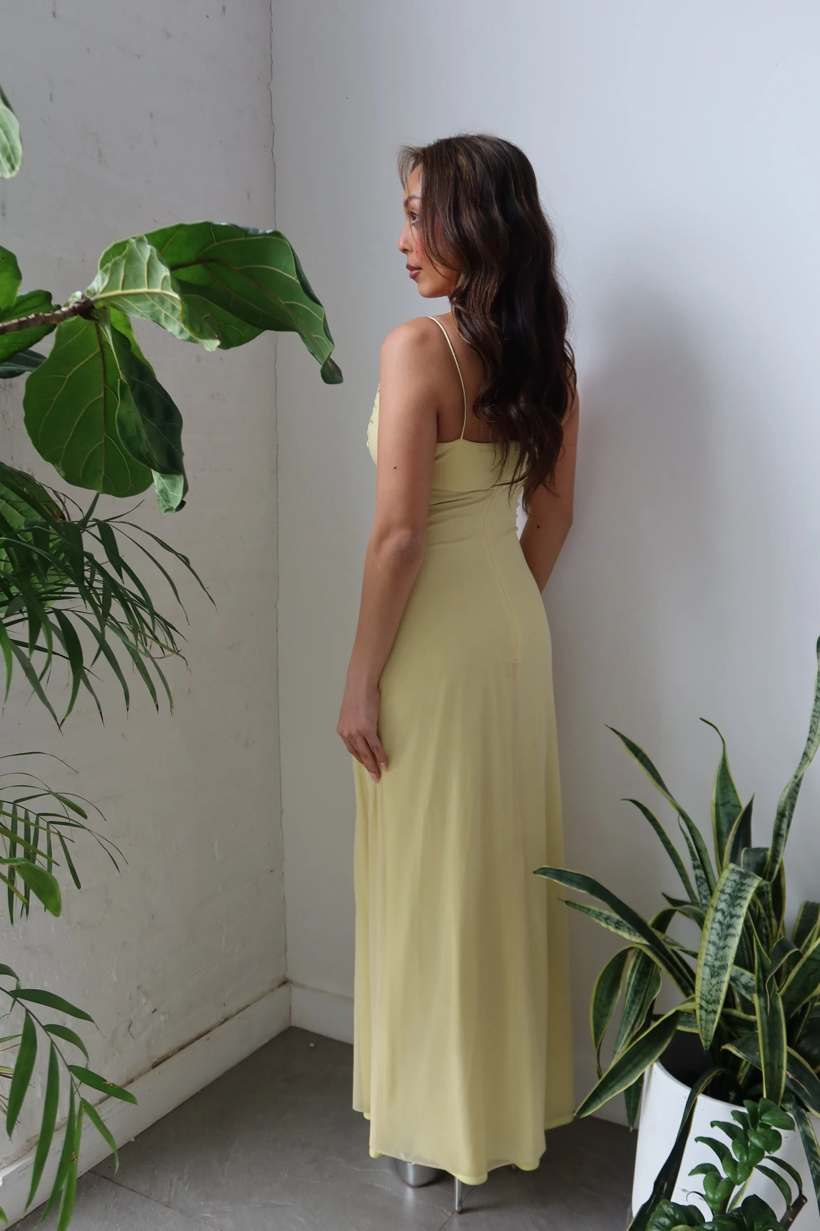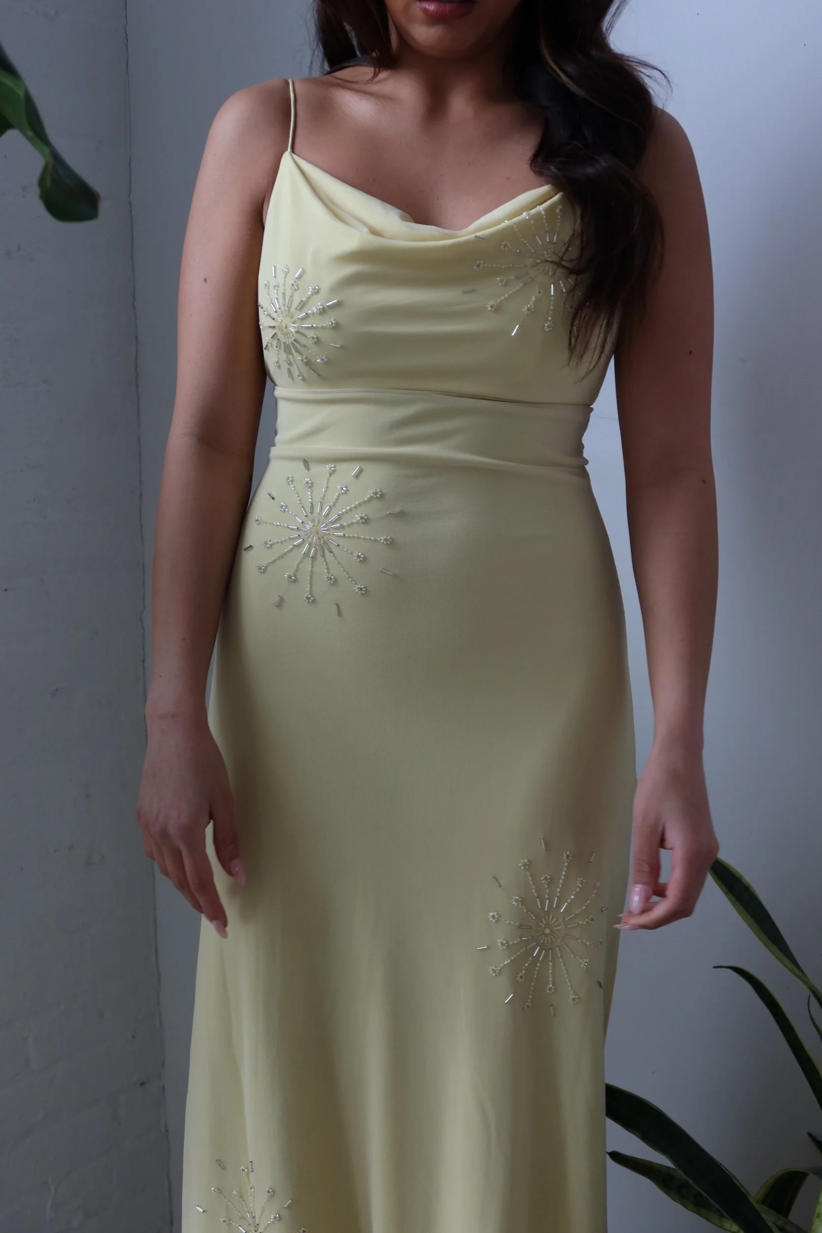 Soft and ethereal, this De Laru gown features a delicate buttery yellow tone with intricate beaded starburst detailing scattered throughout, catching the light beautifully with every movement. The sleek, body-skimming silhouette creates an effortlessly elegant, luminous look. Perfect for Prom!