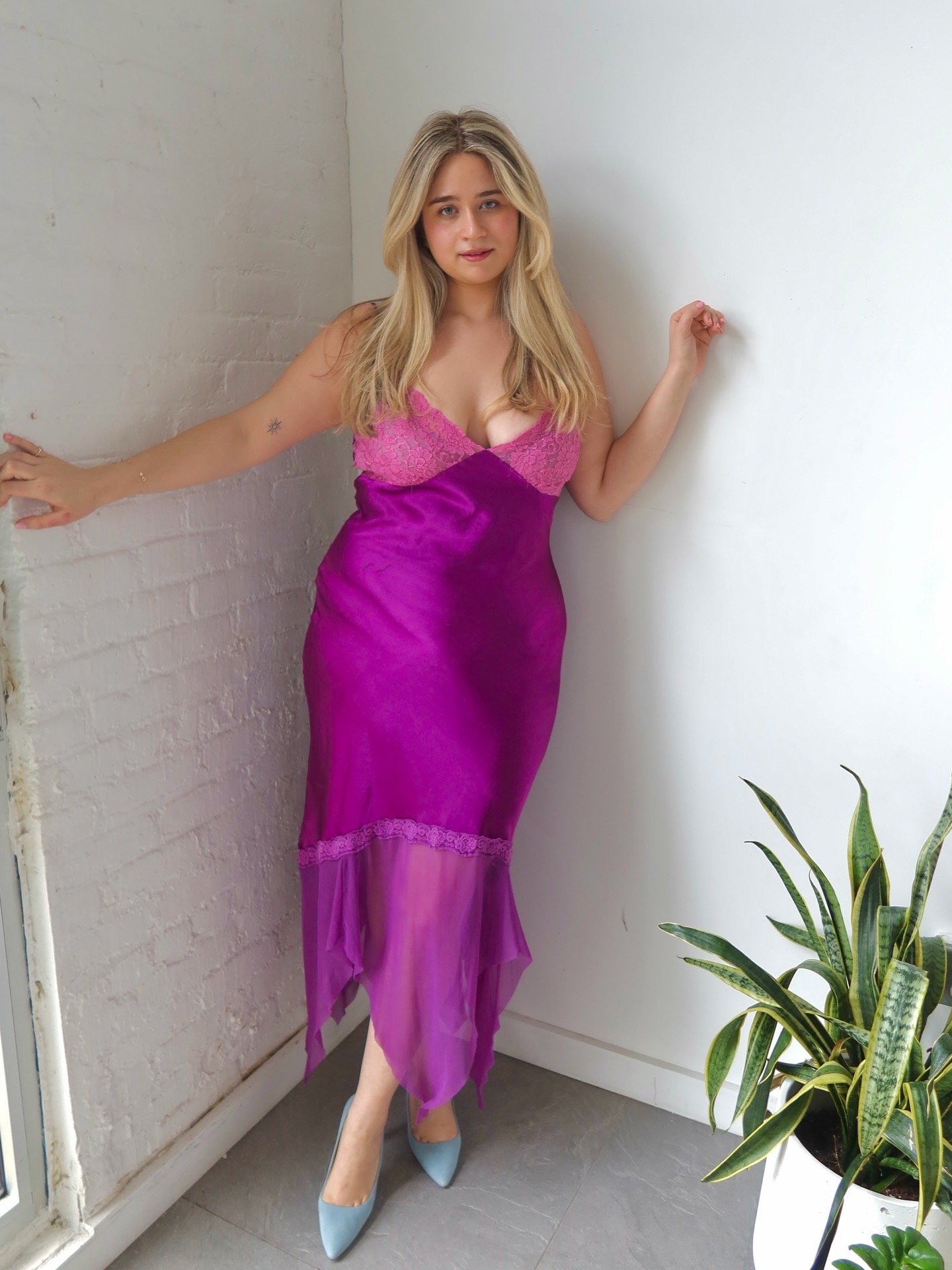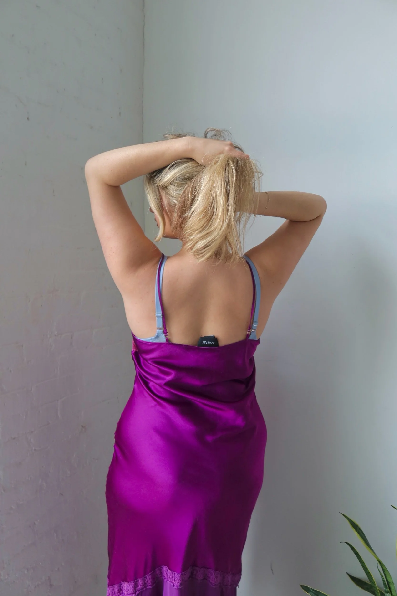 Bold and ultra-feminine, this Ashro slip features a rich purple satin with a flattering mermaid-style silhouette that hugs and flares in all the right places. The silky finish and fluid movement give it a dramatic, statement feel.