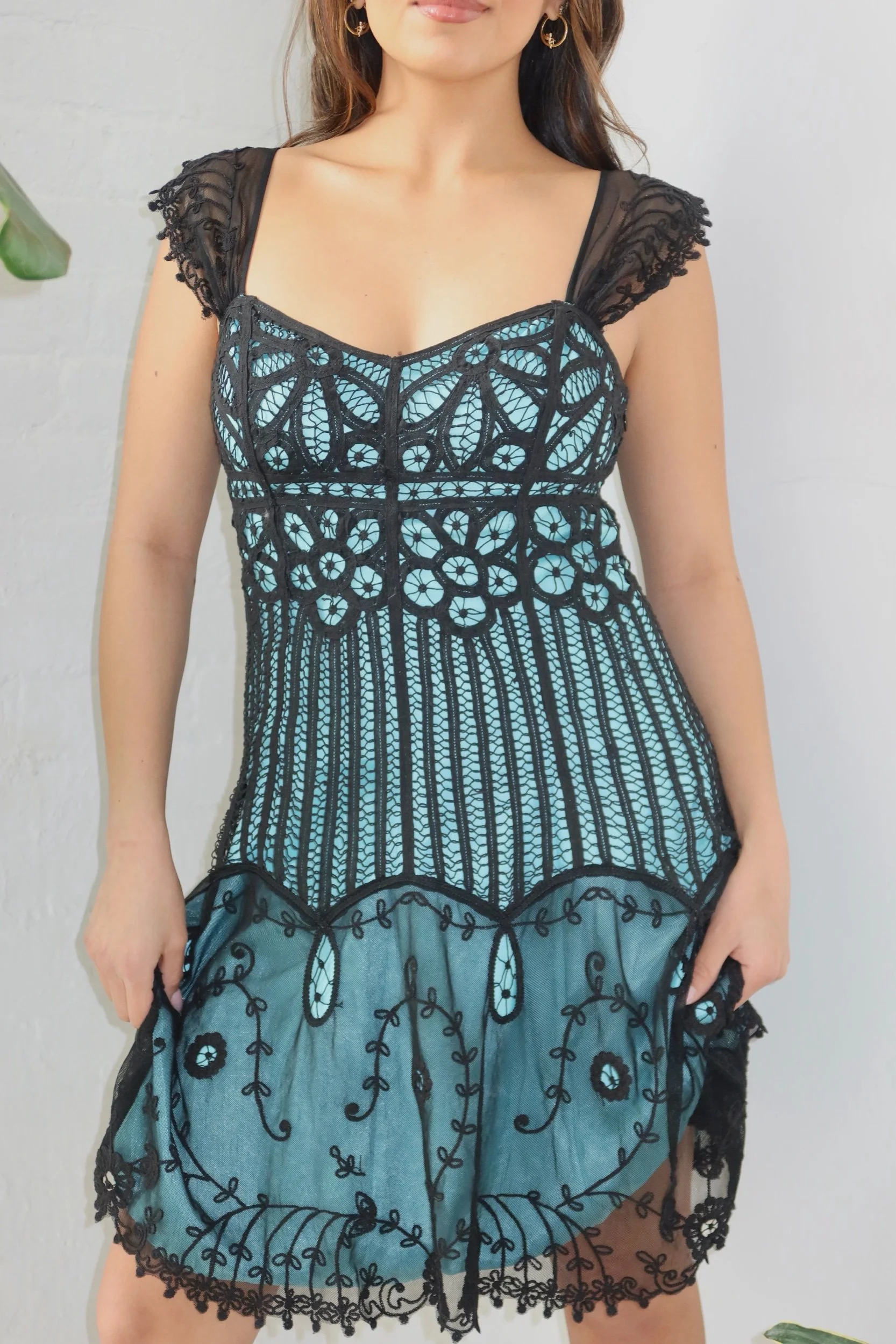 Playful and statement-making, this Betsey Johnson midi features intricate lace detailing with a bold teal underlay and delicate black embroidery throughout. The structured bodice and flared skirt create a flattering, feminine silhouette with a touch of vintage charm.