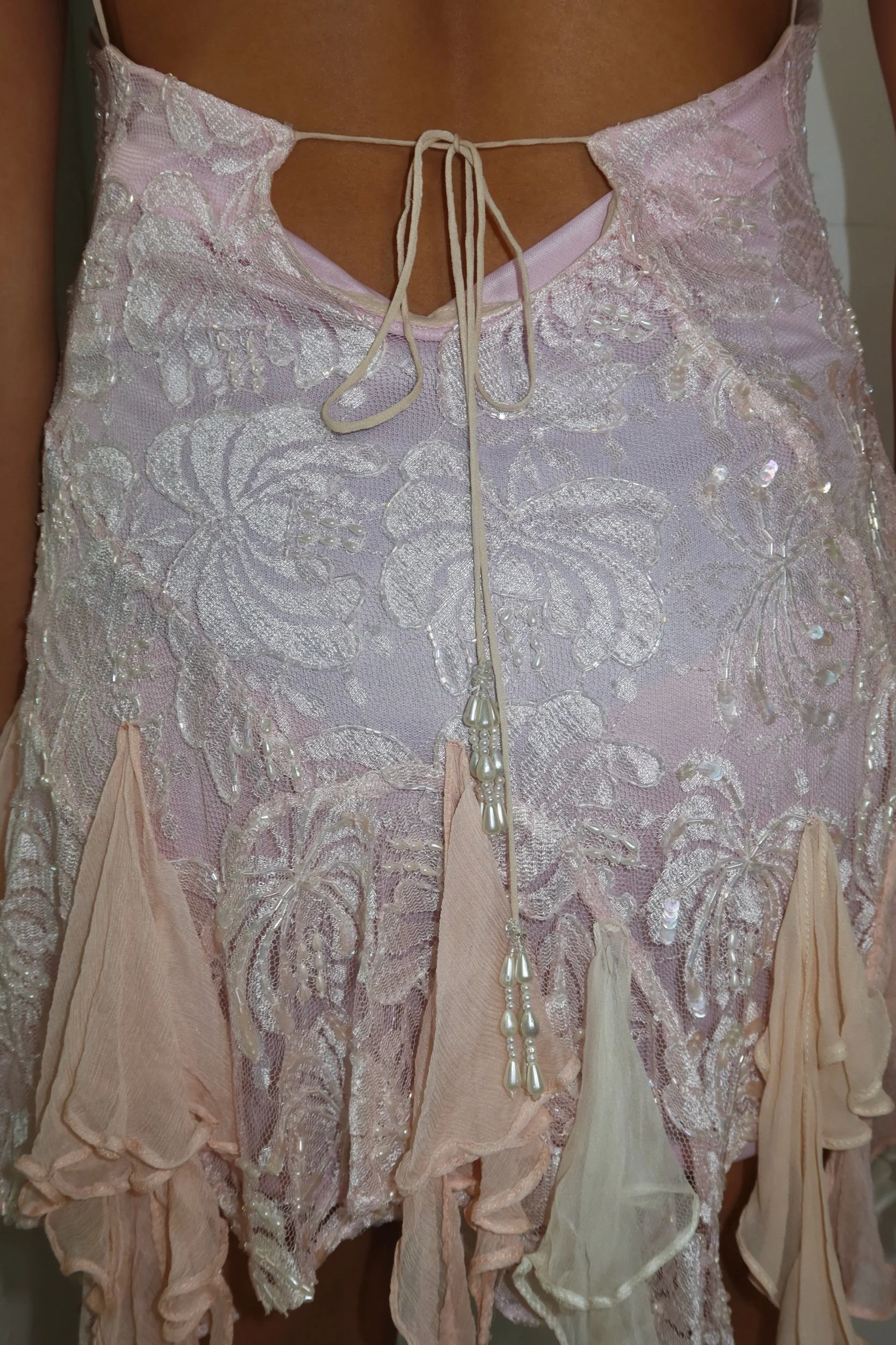 One-of-a-kind and intricately crafted, this handmade silk mini from Thailand features delicate lace detailing and a beautifully layered, asymmetrical hem. The soft pink tones and sheer textures give it a romantic, ethereal feel that truly stands out.