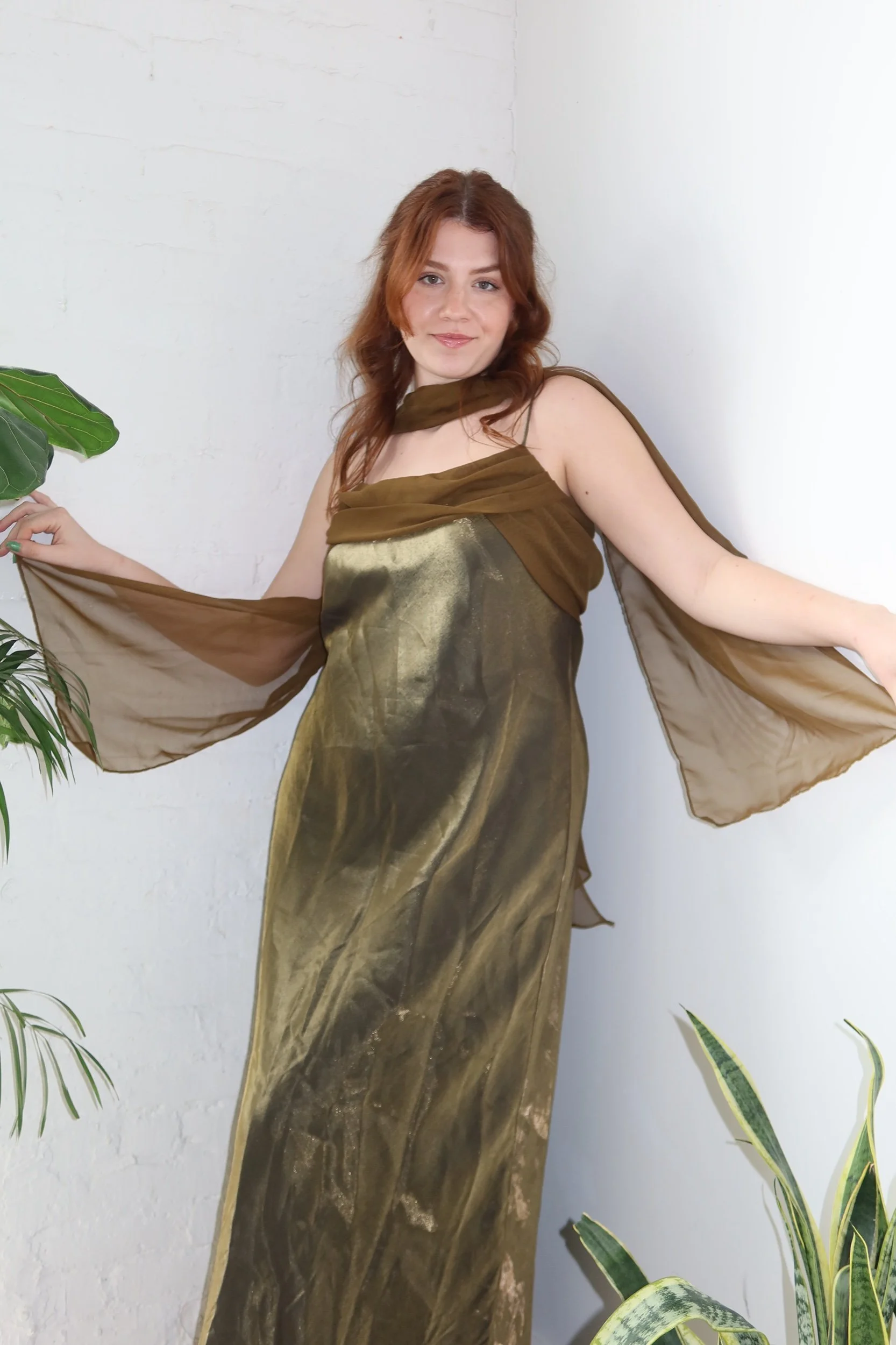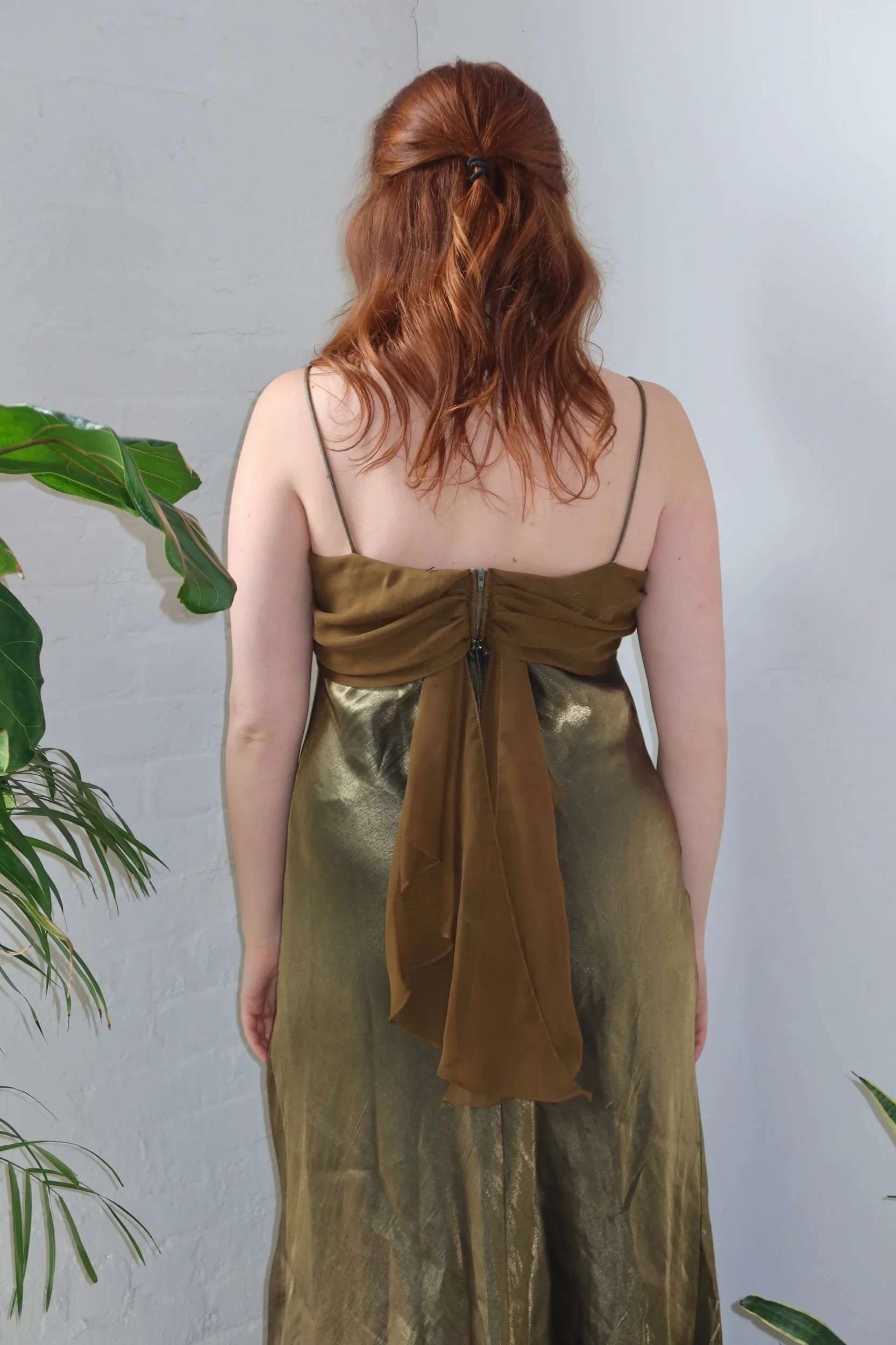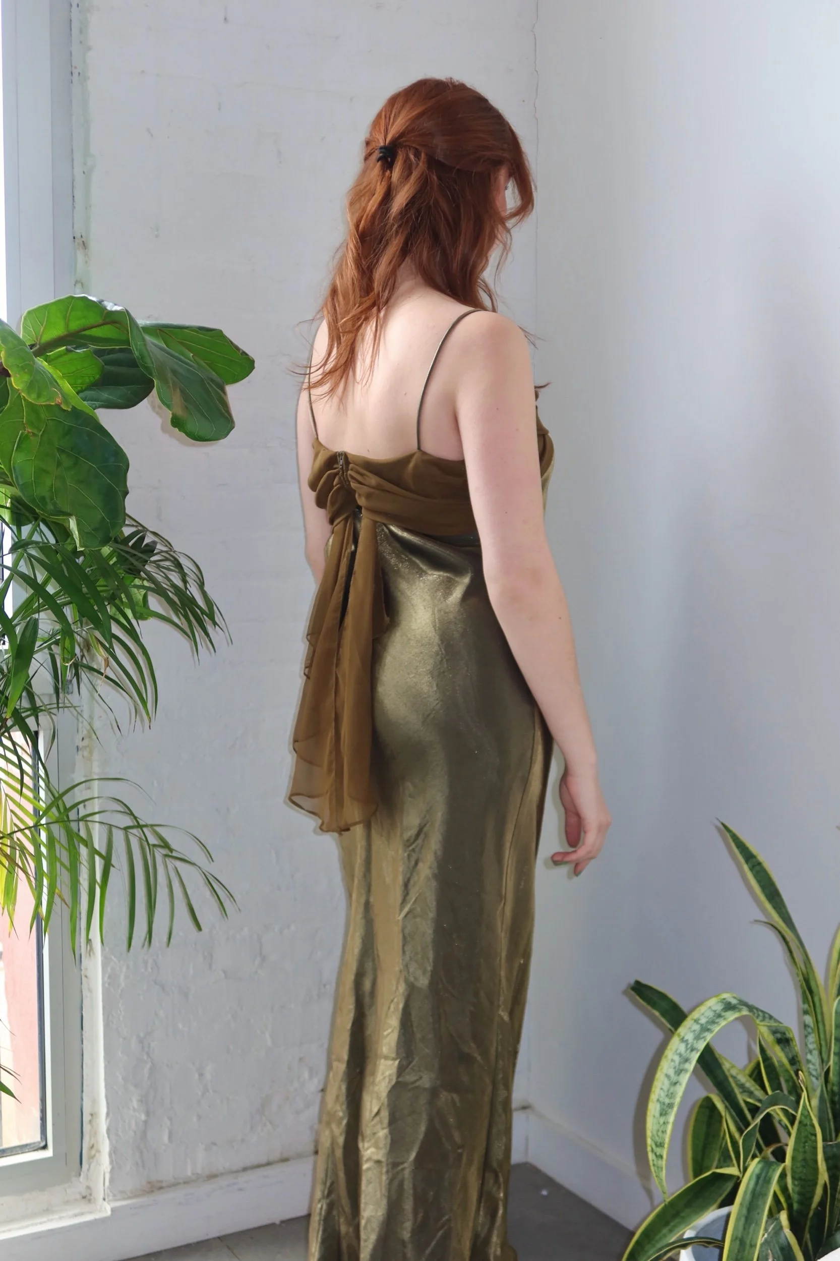 Sleek and striking, this bronze maxi features a silky, metallic sheen with a fluid, body-skimming silhouette. The delicate straps and statement tie-back detail add a soft, feminine touch to an otherwise bold, elevated look. Perfect For Prom!