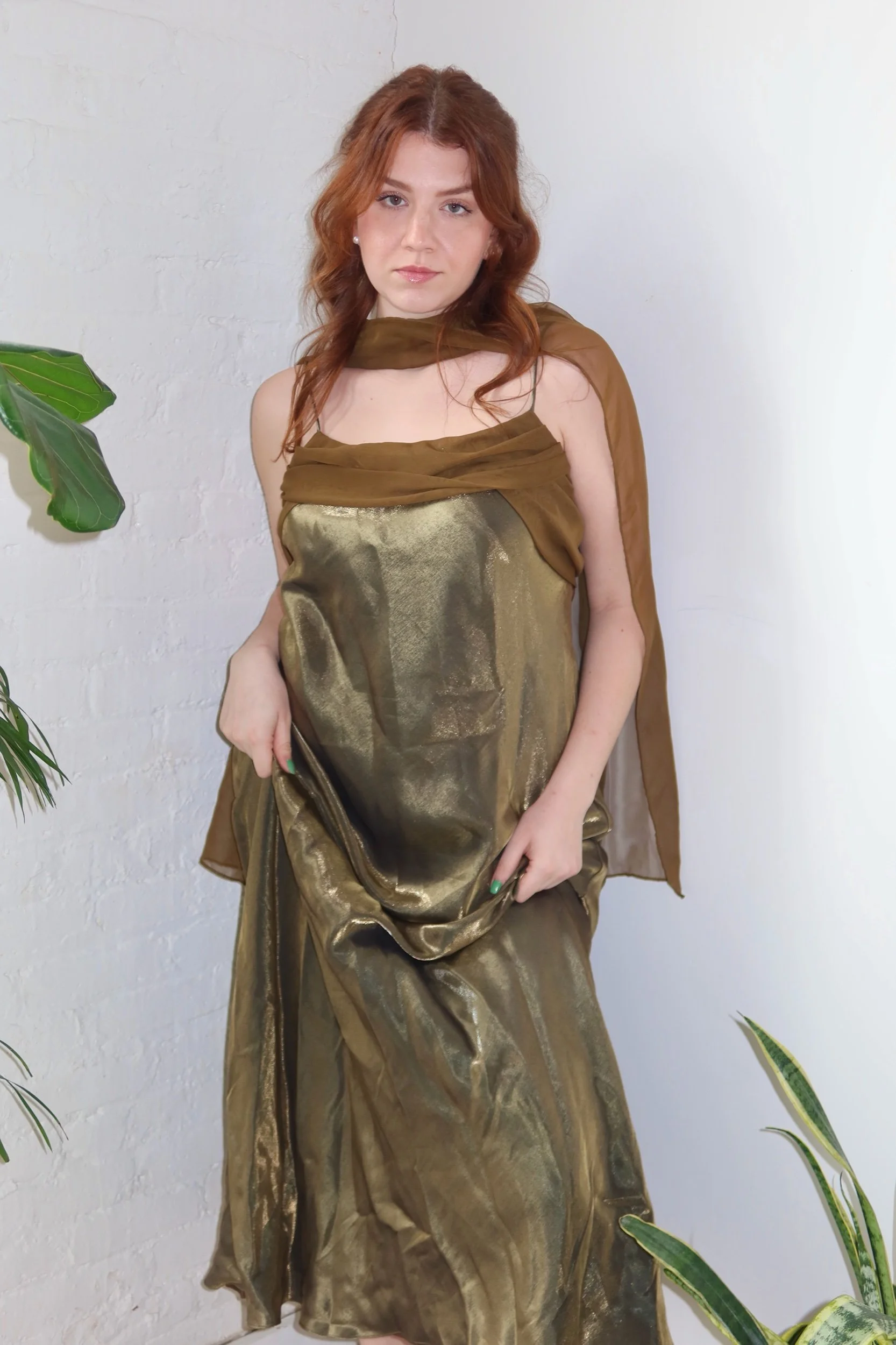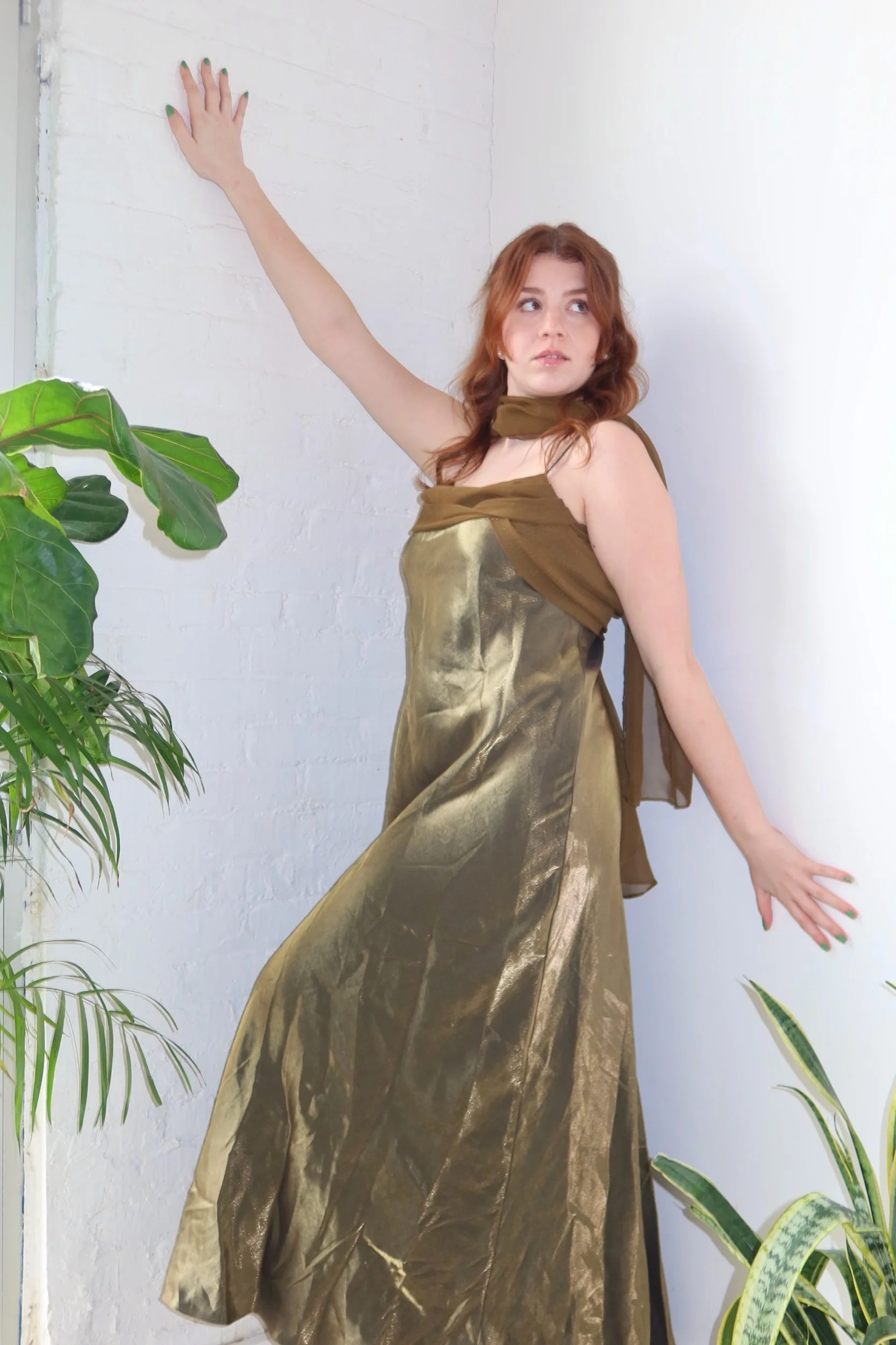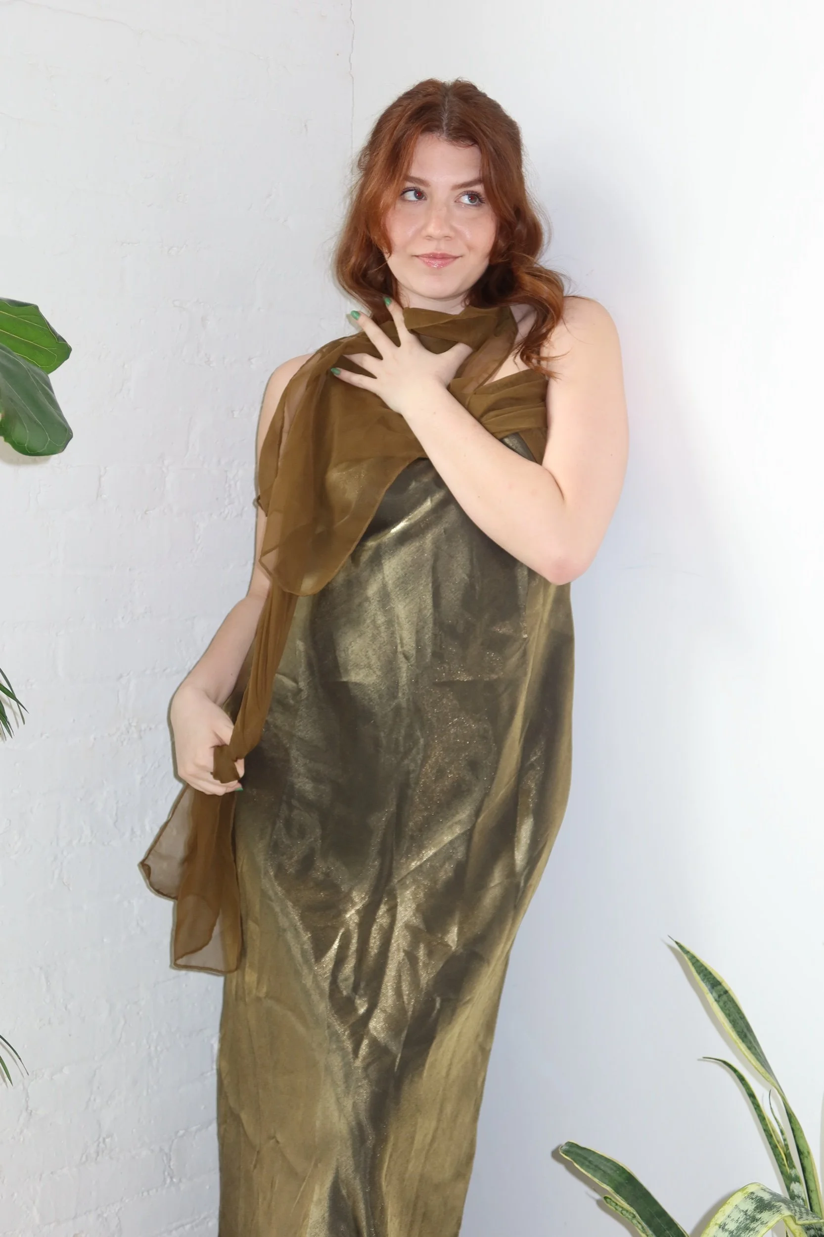 Sleek and striking, this bronze maxi features a silky, metallic sheen with a fluid, body-skimming silhouette. The delicate straps and statement tie-back detail add a soft, feminine touch to an otherwise bold, elevated look. Perfect For Prom!