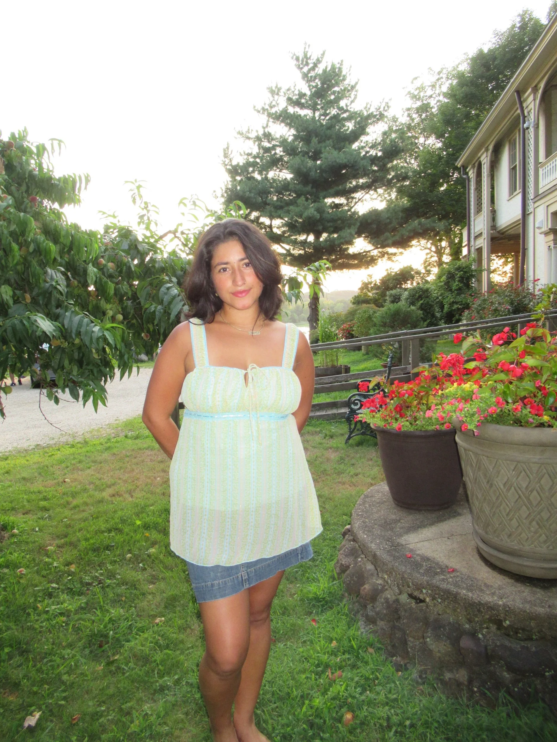 This dreamy sheer babydoll-style blouse features a soft pastel floral and stripe pattern in mint, blue, and blush tones. With adjustable tie details at the front and back, it offers a flattering empire waist silhouette and a flowy, lightweight fit. Wide straps and delicate lace trim give it a sweet and feminine finish. Pair it with a denim mini for the ultimate nostalgic summer look.