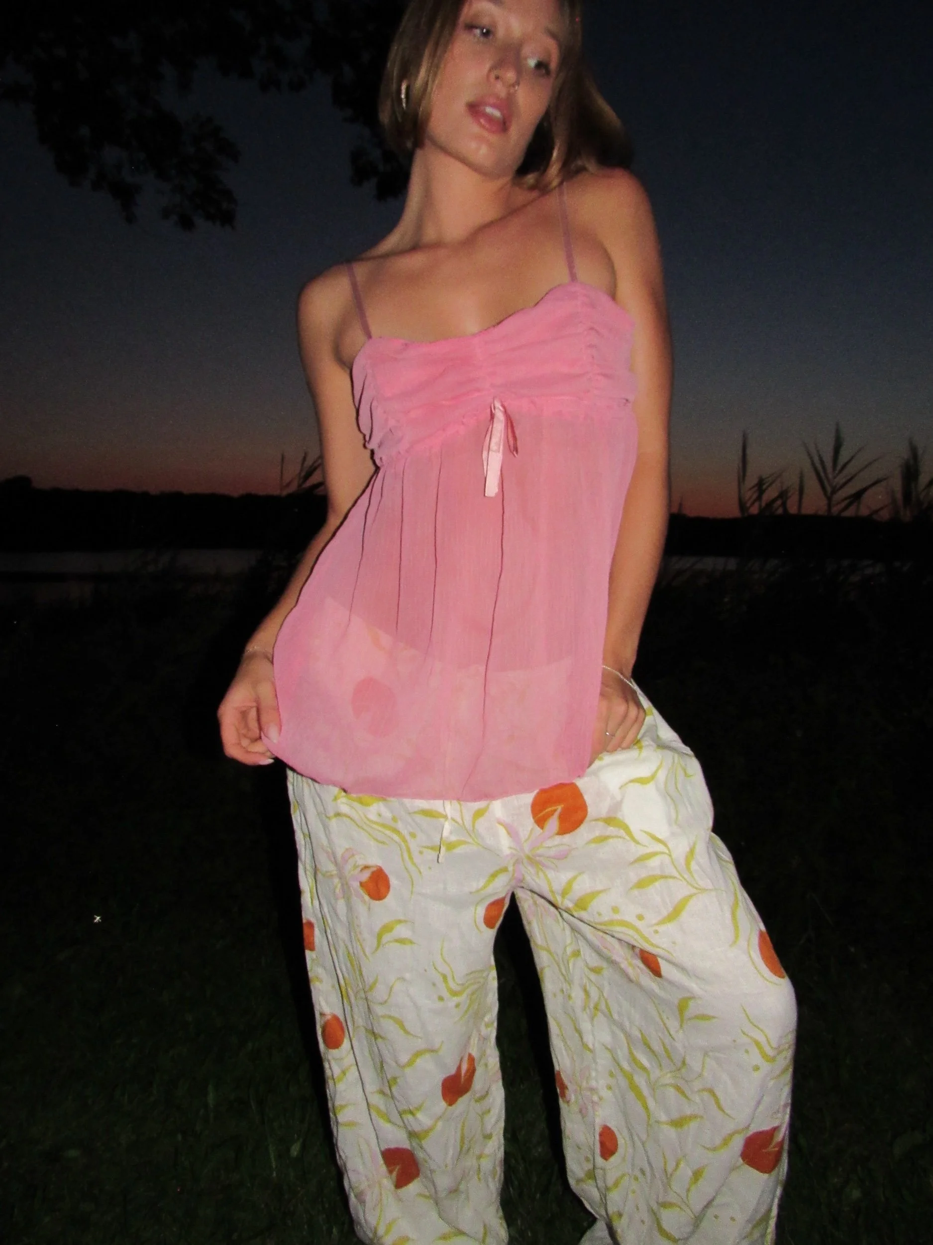 Playful and feminine, this vintage Eyeshadow brand babydoll cami features a soft bubblegum pink hue in airy sheer fabric. The empire waistline is cinched with a satin ribbon tie for adjustable fit, while the lightweight flowy silhouette drapes beautifully. Perfect for layering over bralettes, wearing as lingerie, or styling as a statement top for a Y2K-inspired look.