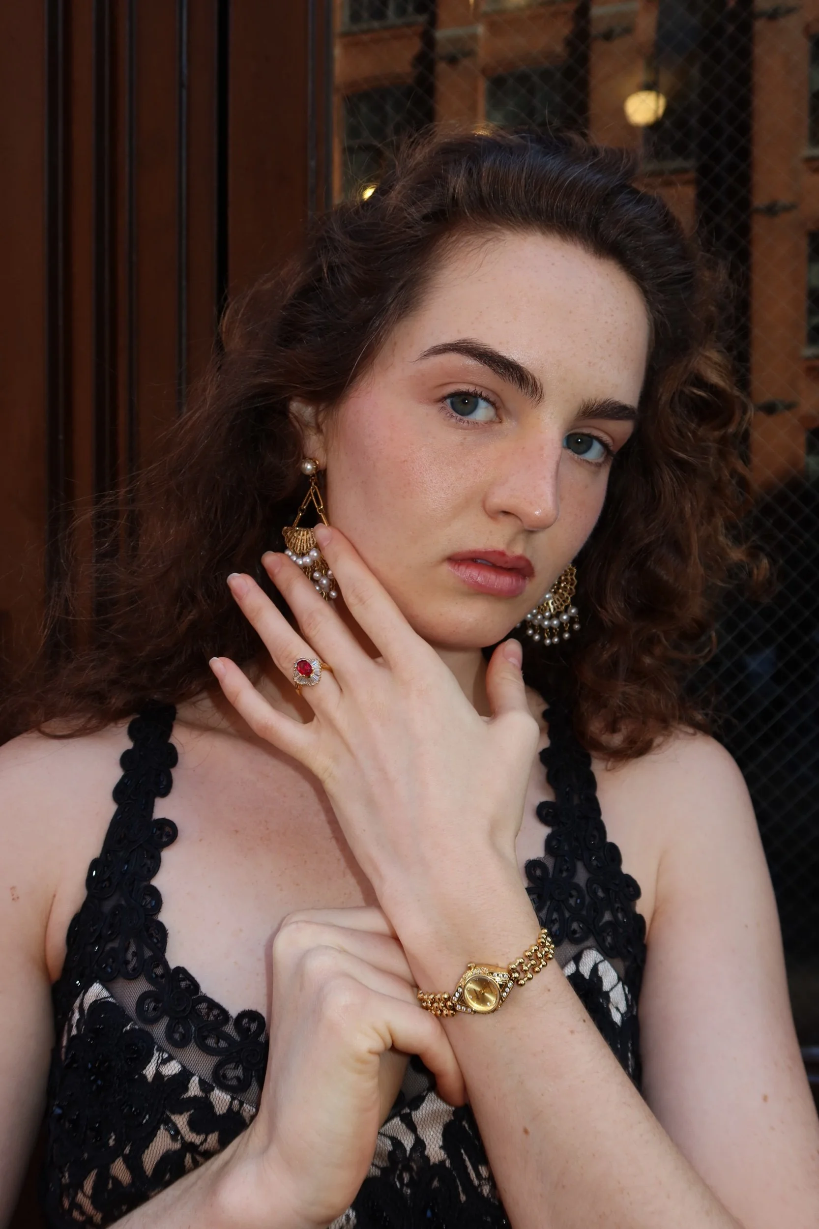 A stunning antique bubble-face bracelet watch that doubles as jewelry. This gold-tone timepiece features a domed crystal “bubble” watch face framed with delicate rhinestones and a woven metal link band, blending old-world craftsmanship with timeless elegance. Perfect for vintage lovers who appreciate pieces that tell a story — wear it stacked with bangles or solo for a statement of quiet luxury.