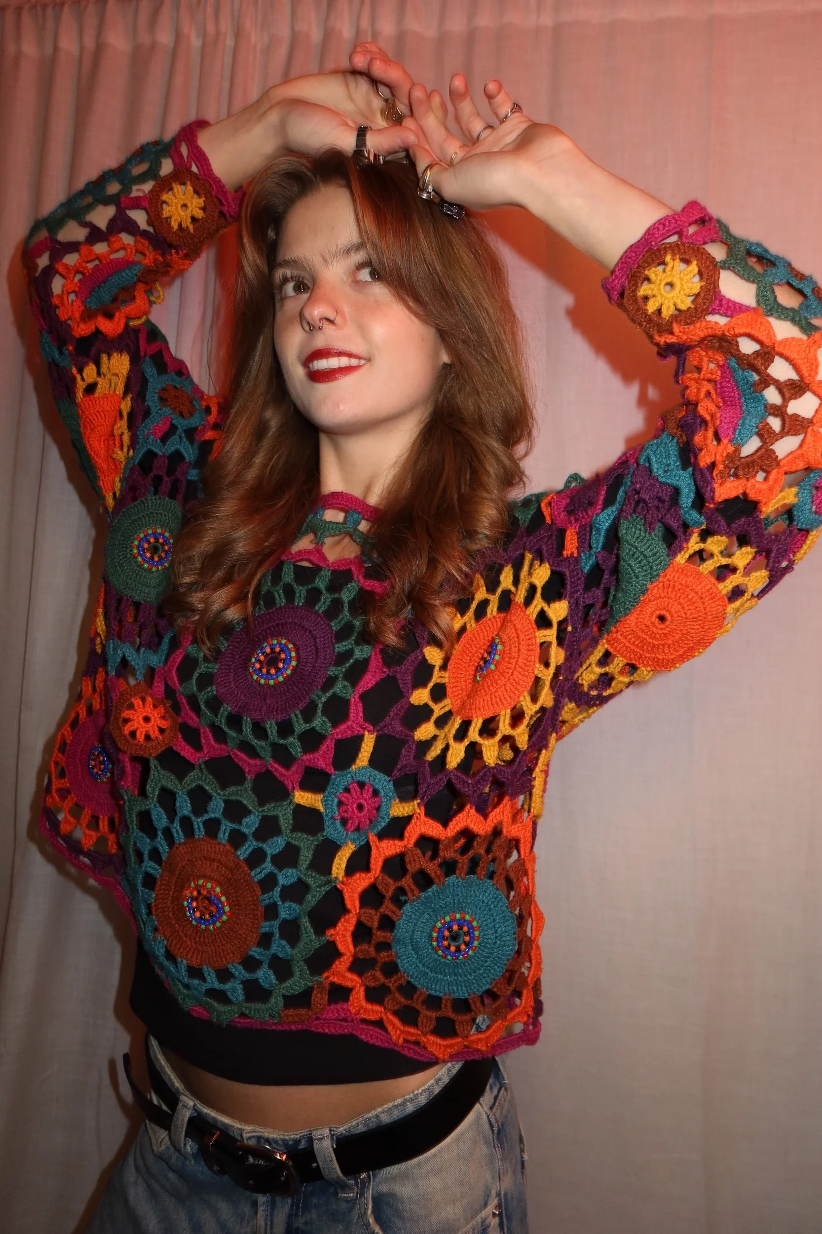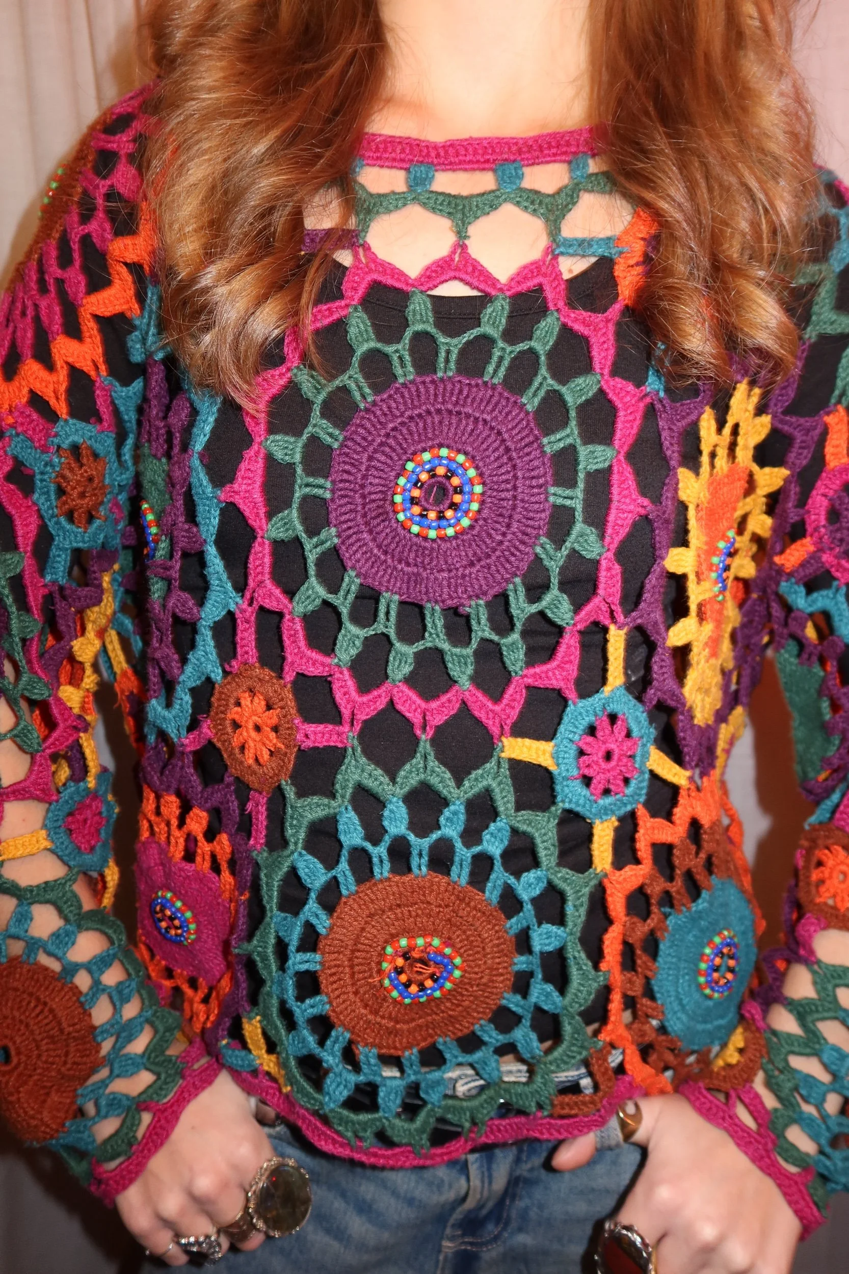 A true 1970s handcrafted macramé crochet top featuring vibrant multicolor yarn, intricate open-weave patterns, and individually stitched beaded accents. This piece is an authentic vintage wearable art collectible — no two tops from this era were ever identical.