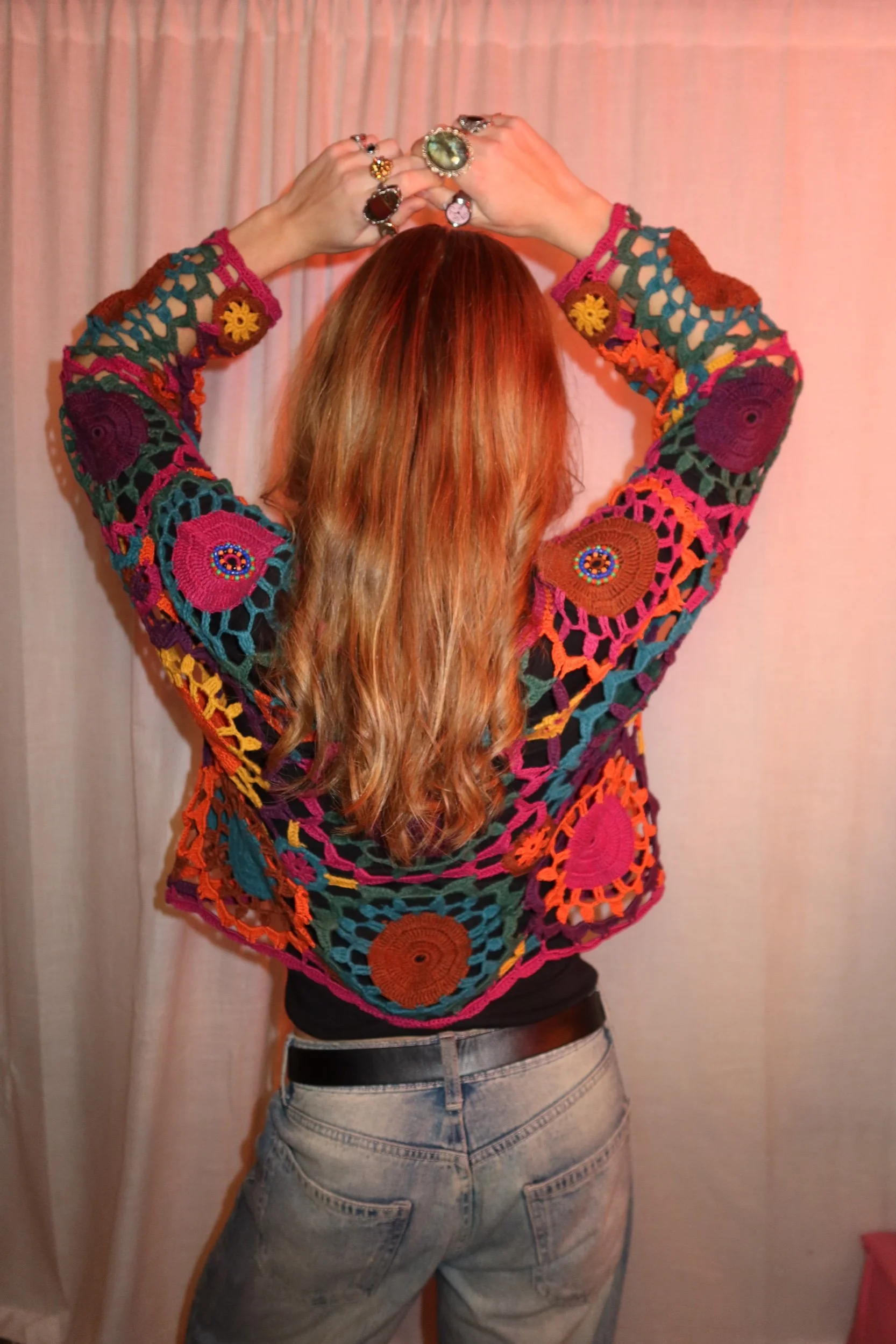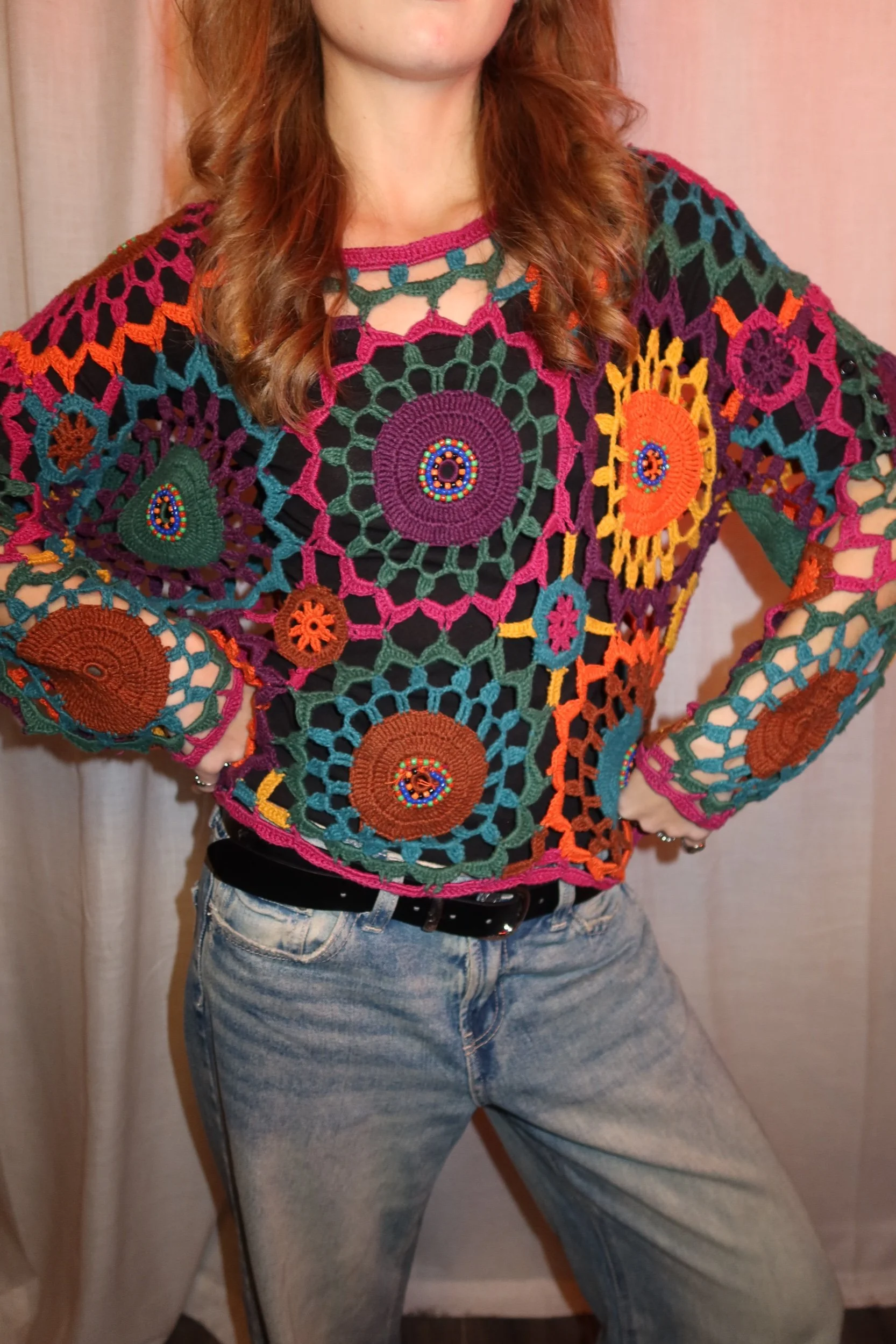 Features: Hand-beaded detailing, open crochet, 70s boho/hippie revival style