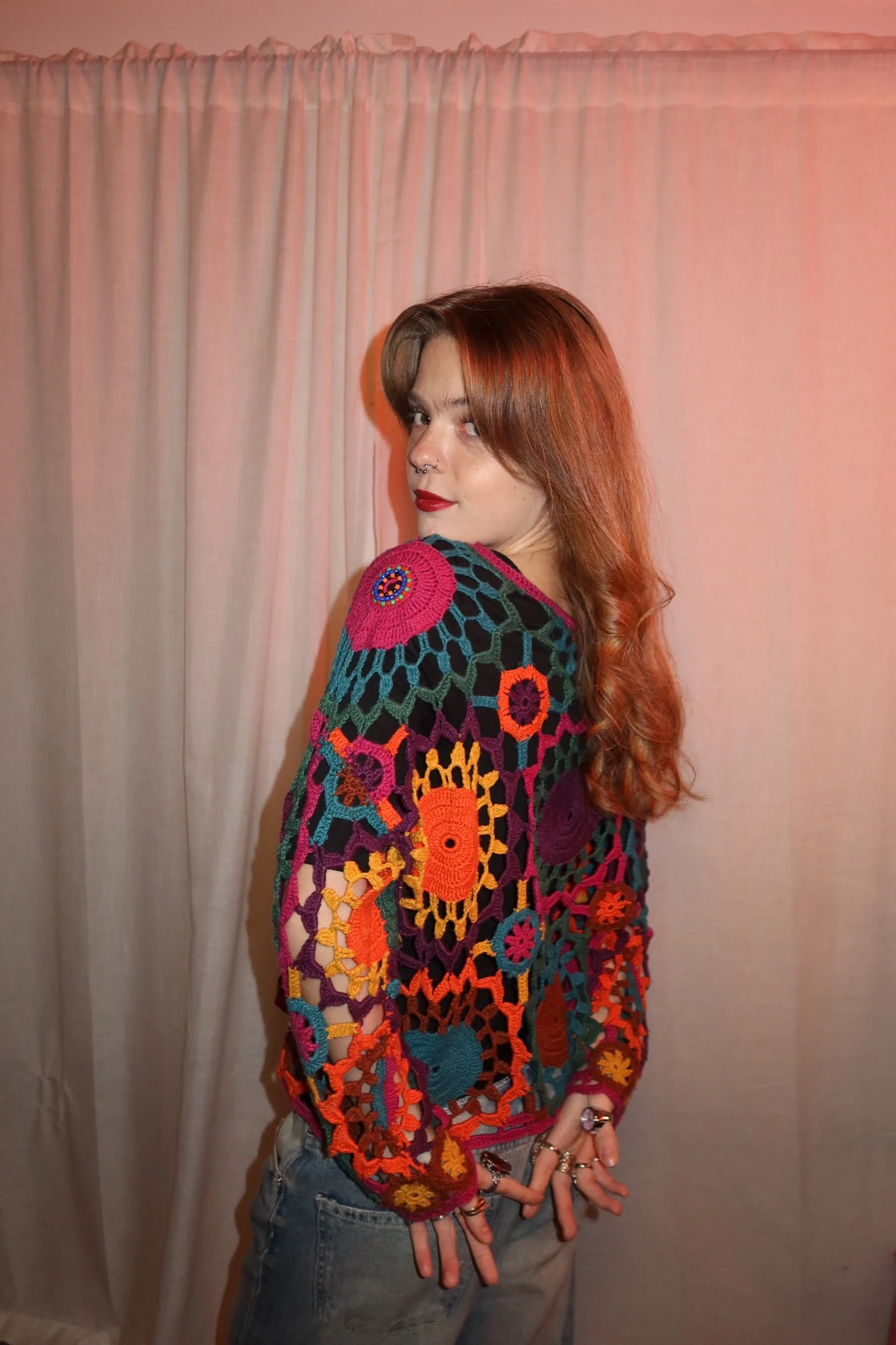 The bold circular motifs, rich jewel-tone palette, and hand-knotted construction make it a standout for festivals, editorial shoots, or adding a rare vintage statement to your wardrobe. Looks incredible layered over a bralette, bandeau, or slip.