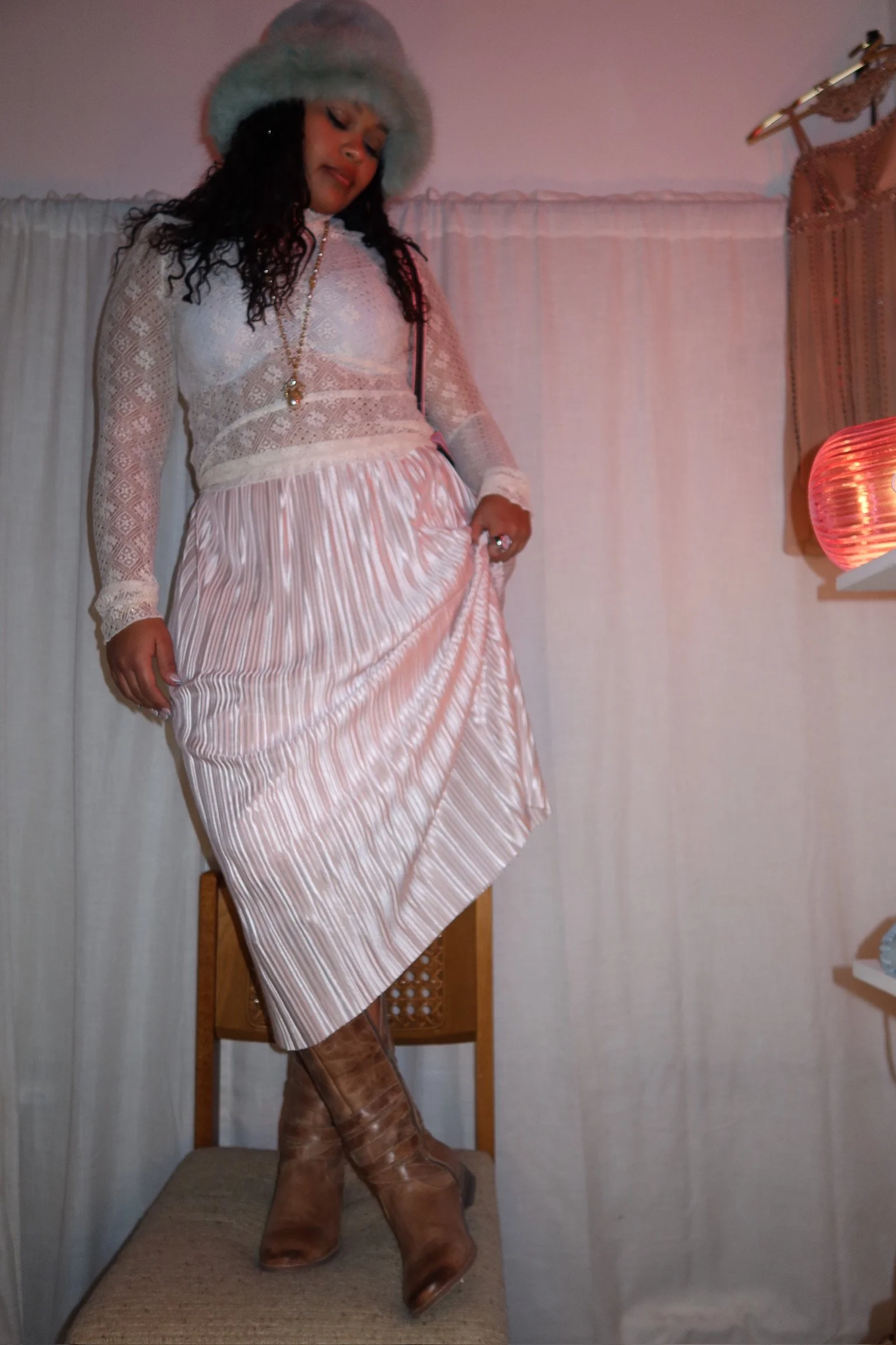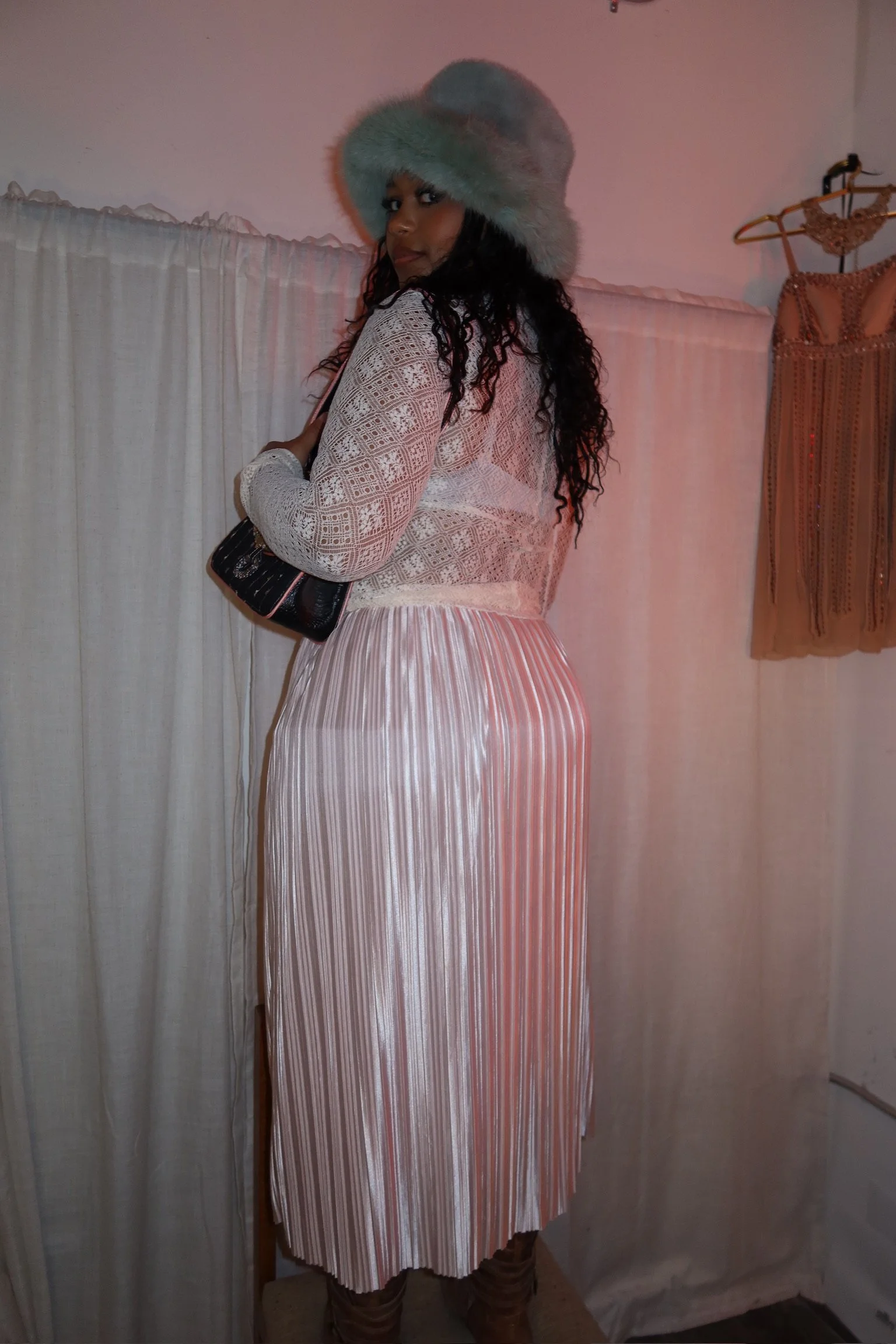 A dreamy silky pink skirt with the prettiest sheen and movement — lightweight, flowy, and so flattering. The pleated texture catches the light beautifully, giving that soft, feminine, ballet-inspired feel.