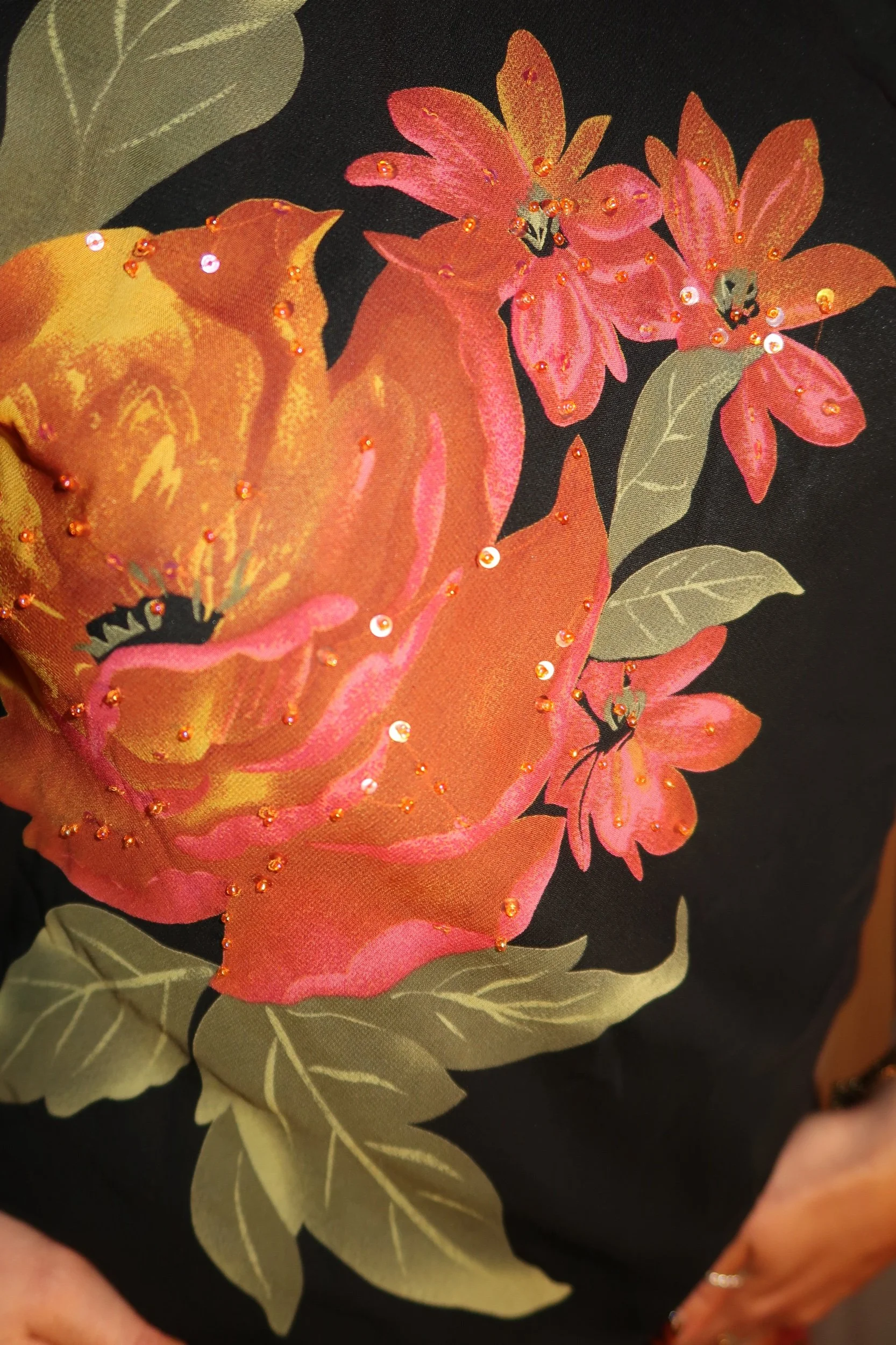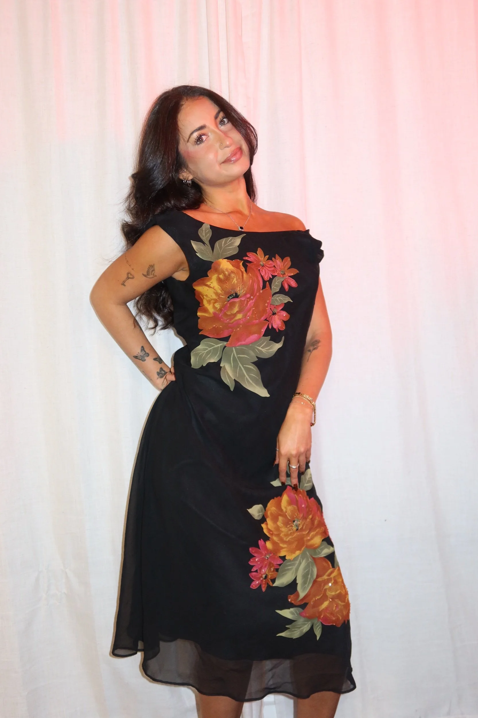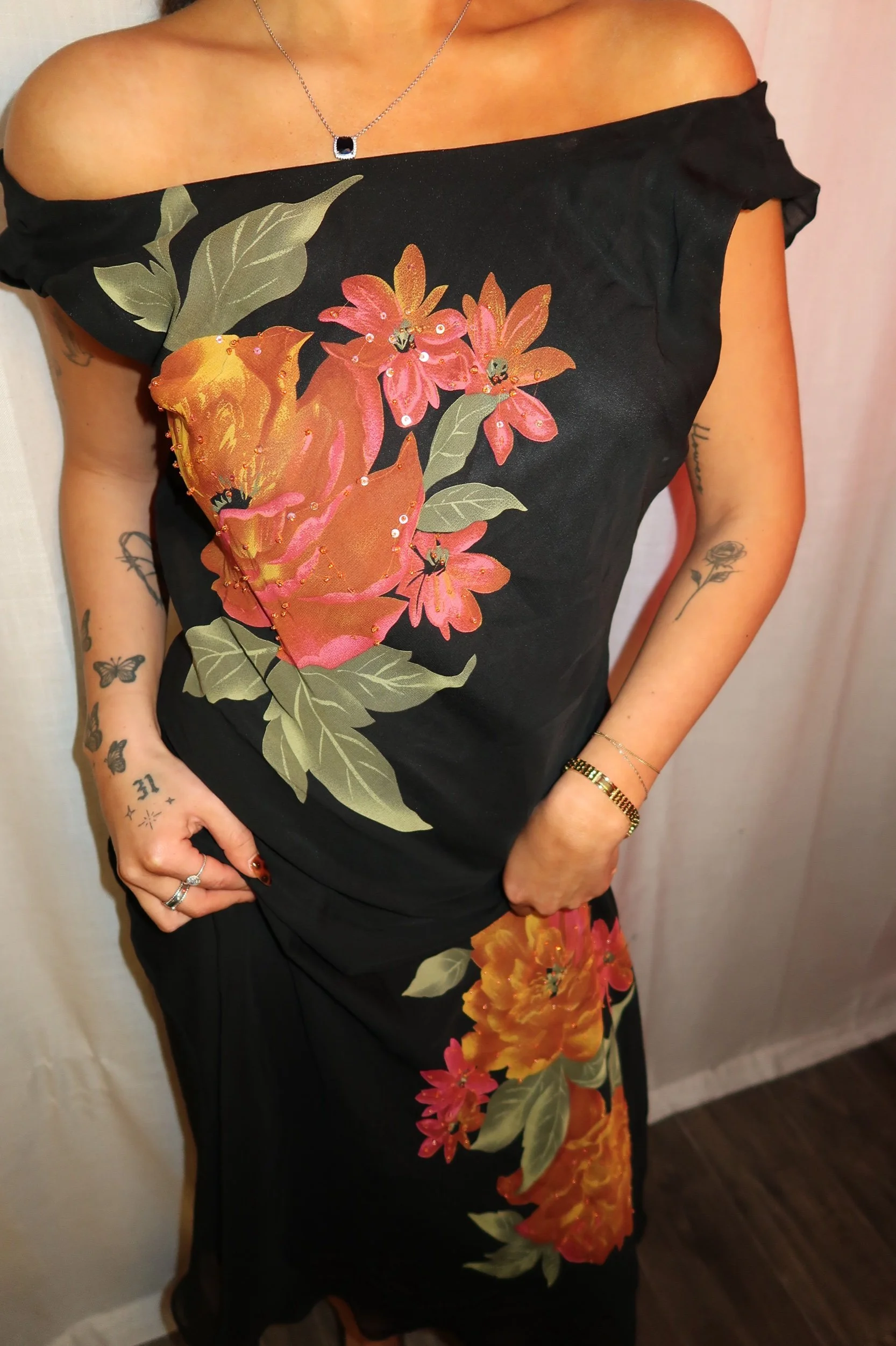 A breathtaking vintage midi crafted from lightweight fabric and painted with oversized botanical florals. The off-shoulder neckline drapes effortlessly, giving that romantic, Old-World elegance while still feeling modern and wearable. The bias-cut body skims beautifully, creating natural movement with every step.