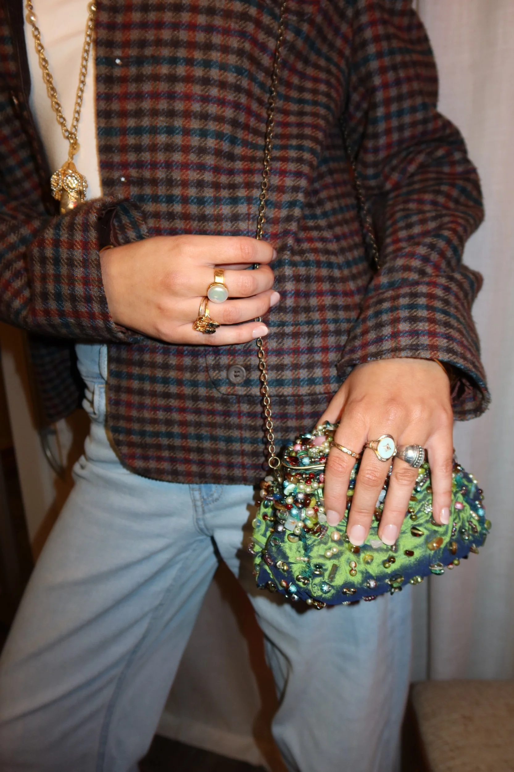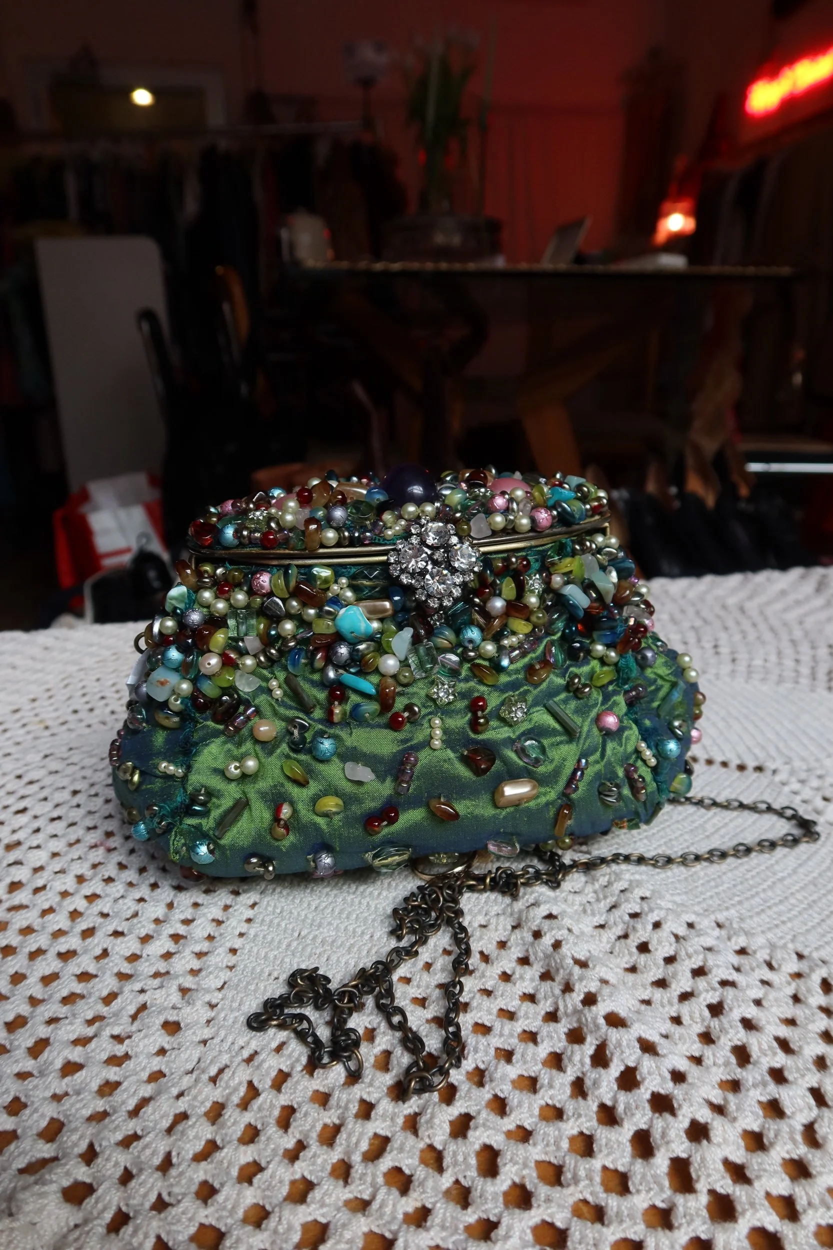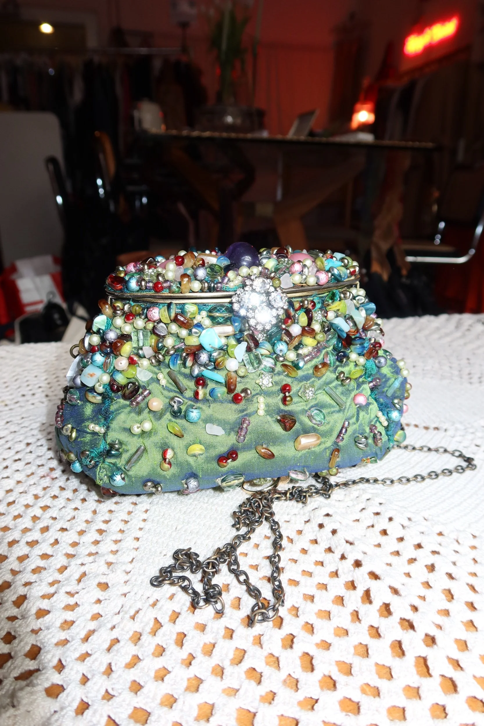 A rare, collectible Mary Frances statement clutch — fully hand-beaded with vibrant multicolor glass beads, pearls, and textured embroidery. Features a jeweled front accent, soft satin base, and a detachable metal chain strap for shoulder or crossbody wear.